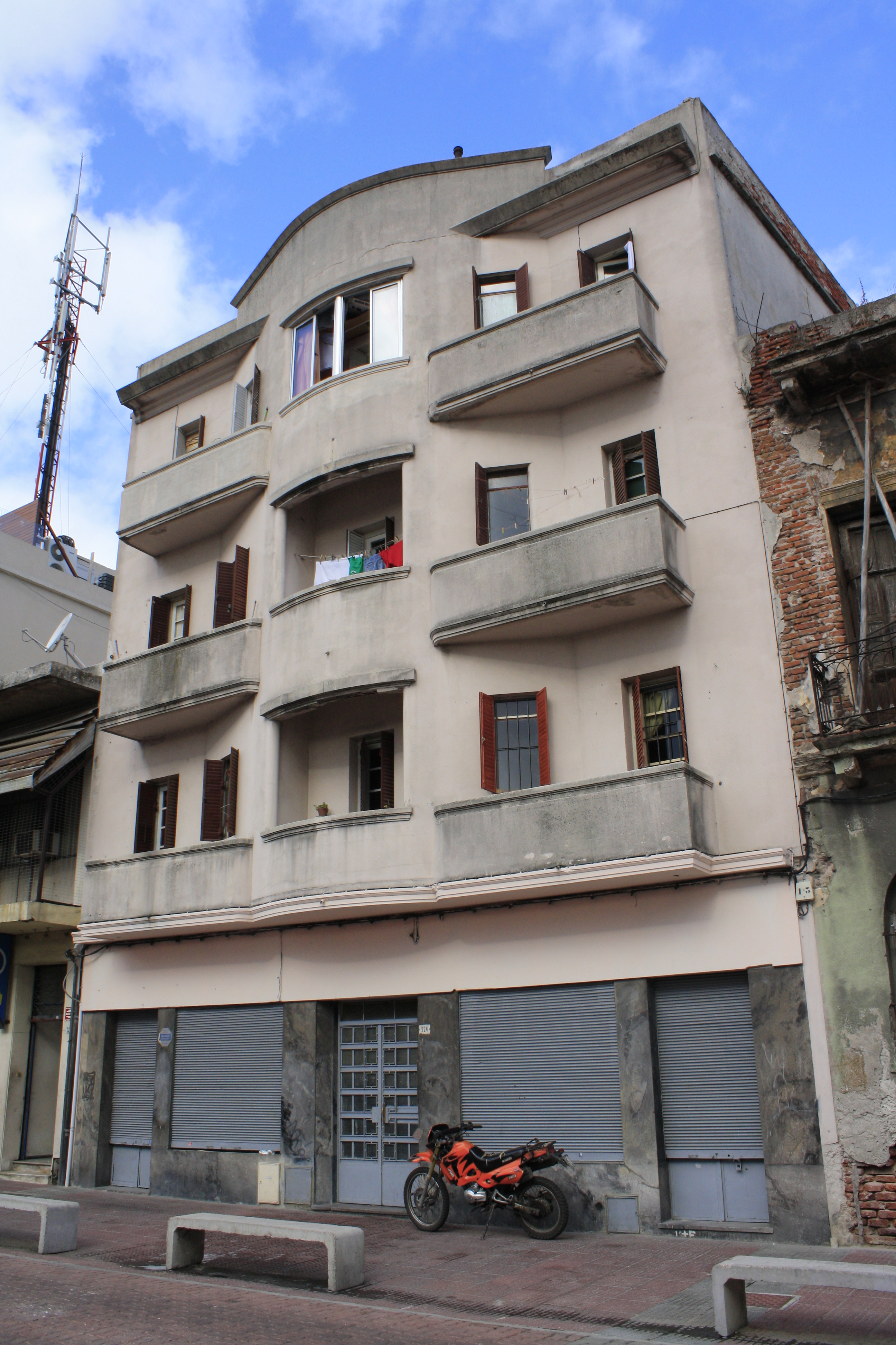 Edificio de renta entre medianeras en torno a dos pozos de aire y luz laterales y uno posterior, con planta baja comercial, ocupando la totalidad del frente de la parcela. Construido en la década de 1930, se desarrolla en cuatro niveles, la planta baja alberga dos locales comerciales actualmente desocupados y el acceso común para las viviendas que se desarrollan en el primer, segundo y tercer nivel (seis por cada piso). La fachada es simétrica acentuada por un plano curvo saliente que jerarquiza el acceso.