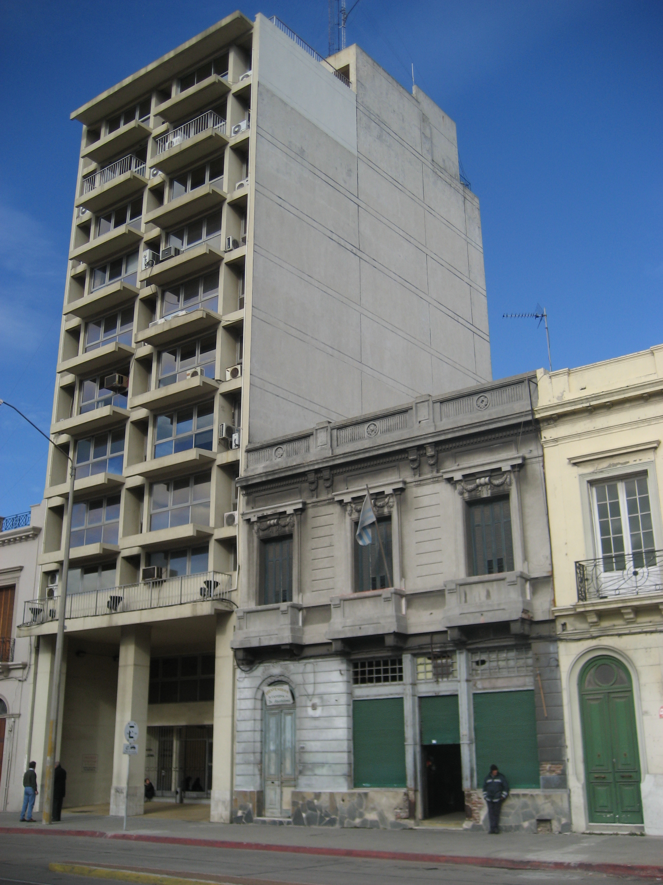| Urbanística: | Edificio que destaca por su excesiva altura, afectando un entorno que, aunque con problemas de conservación, resulta morfológicamente uniforme y patrimonialmente destacado, cercano a la centralidad del Mercado del Puerto. Es un ejempo muy ilustrativo de los grandes perjuicios que sufre un entorno homogéneo cuando se altera la altura permitida sin tomar en consideración la volumetría general. Por su excesiva altura y contundente volumetría resulta absolutamente incompatible con el entorno, distorsionando dramáticamente la imagen que la Ciudad Vieja muestra hacia la rambla portuaria. La pasiva generada en PB y primer piso supone un alejamiento de la alineación mantenida en el resto del tramo y sólo contribuye a enfatizar aún más el carácter negativo y disonante de este edificio en el contexto urbano portuario. |