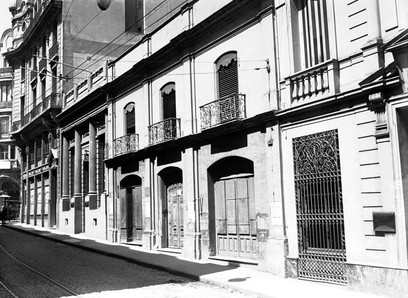 Edificio construido entorno a 1920 y ampliado en la década de 1950, con la incorporación de un segundo piso. Sus actuales dos niveles, se estructuran en torno a un patio central, albergando las instalaciones del Banco Itaú, conectado funcionalmente con el padrón contiguo sobre la esquina. La planta baja presenta una fachada simétrica en la cual se disponen cuatro columnas jónicas elevadas sobre un basamento de granito, entre las cuales se organizan los vanos coronados por guirnaldas. Sobre la cornisa se eleva el segundo nivel con un lenguaje de mayor austeridad y siguiendo las lineas preponderantes en la composición de la planta baja. Se encuentra en buen estado de conservación.