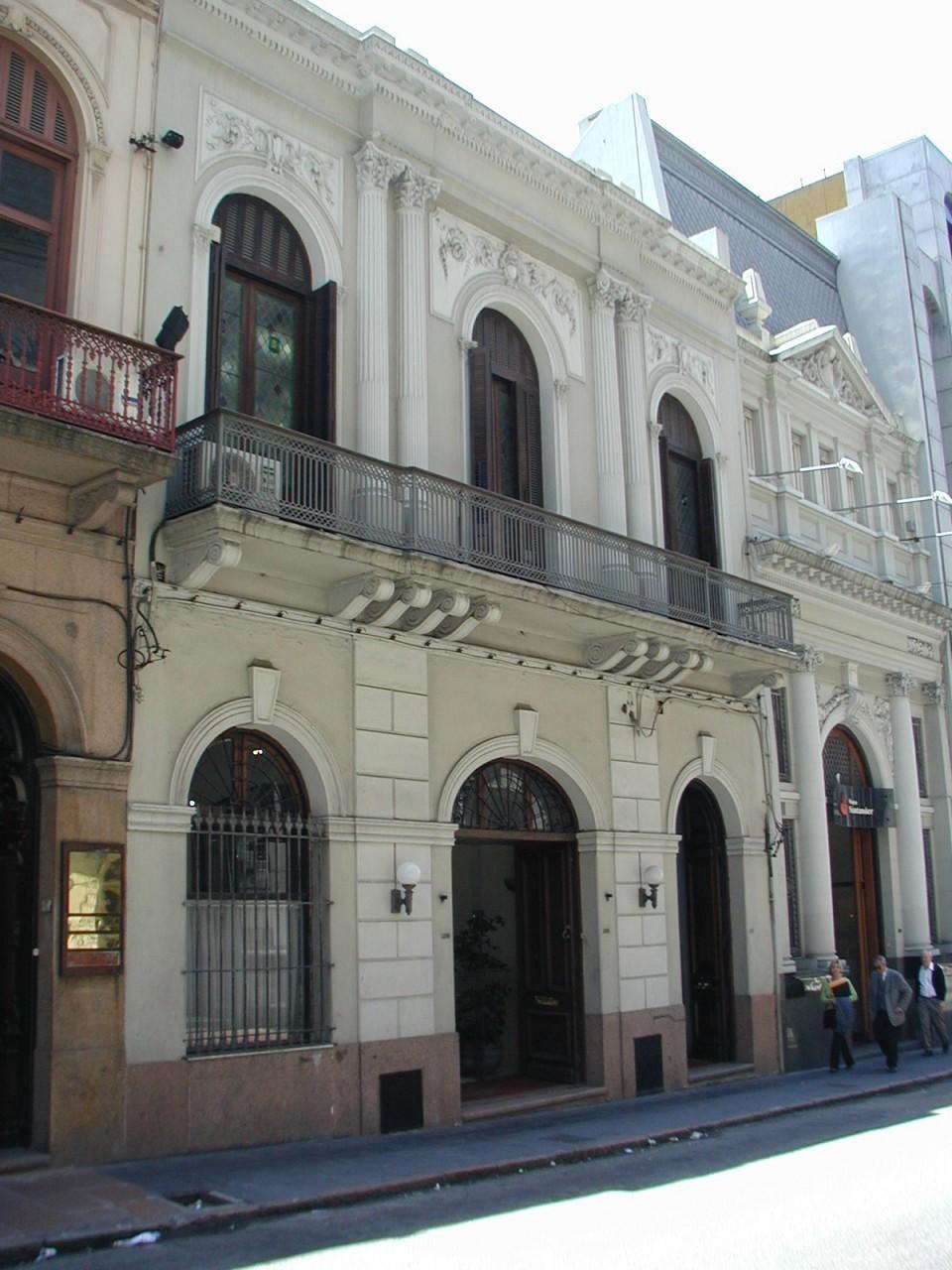 Edifico de vivienda de dos niveles con planta baja comercial construido en el último cuarto del siglo XIX. Su fachada de composición simétrica, se estructura en tres paños definidos por vanos con arco. Cobra jerarquía el central, enmarcado por pilastras en planta baja y dos pares de medias columnas corintias en planta alta. Destacan el balcón corrido de herrería sobre ménsulas, los guardapolvos decorados de planta alta y el remate, conformado por una cornisa sobre modillones y un friso que ha perdido la totalidad de su ornamentación. Conforma junto a su lindero Oeste una unidad formal. En el año 1998 fue reciclado y actualmente aloja oficinas del banco Santander. Su interior conserva elementos originales como las carpinterías y revestimientos. El edificio se encuentra en buen estado de conservación desde la reforma.