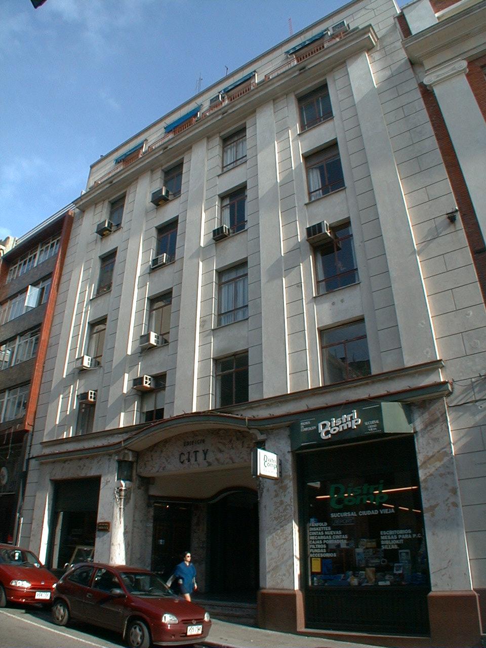 El edificio original construido en la década de 1920 se desarrollaba en dos niveles, destinados a la actividad financiera. Fue ampliado en la década de 1940 agregándosele cinco niveles, y actualmente ubica dos locales comerciales en la planta baja y oficinas en los pisos superiores. Su fachada se organiza en forma simétrica, con el acceso principal en el centro, jerarquizado por un arco formado por la cornisa. Acentúa la verticalidad el tratamiento con pilastras en todo el cuerpo del edificio, rematando en una segunda cornisa, sobre la cual se eleva un último nivel. La fachada se ve afectada por el uso de equipos de aire acondicionado no previstos. Como dato curioso, parte del padrón 3051, tiene frente a la calle Misiones, entre los padrones 3044 y 3046, aunque el mismo es imperceptible desde esa calle, talvez coincidiendo con este edificio.