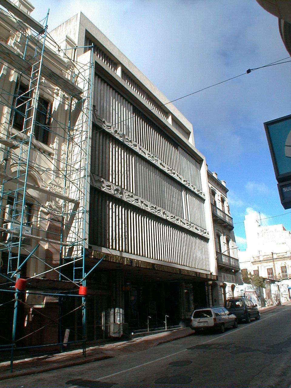 Edificio de cinco niveles y subsuelo construido en la década de 1960, destinado a la actividad financiera. Actualmente es propiedad del MVOTMA y utilizado por él. El volumen organiza los tres primeros niveles avanzando sobre la vía pública y un último piso alineado sobre la linea de edificación. En su fachada racionalista, de grandes superficies vidriadas, se destaca el tratamiento con parasoles verticales de aluminio. Su estado de conservación es bueno.