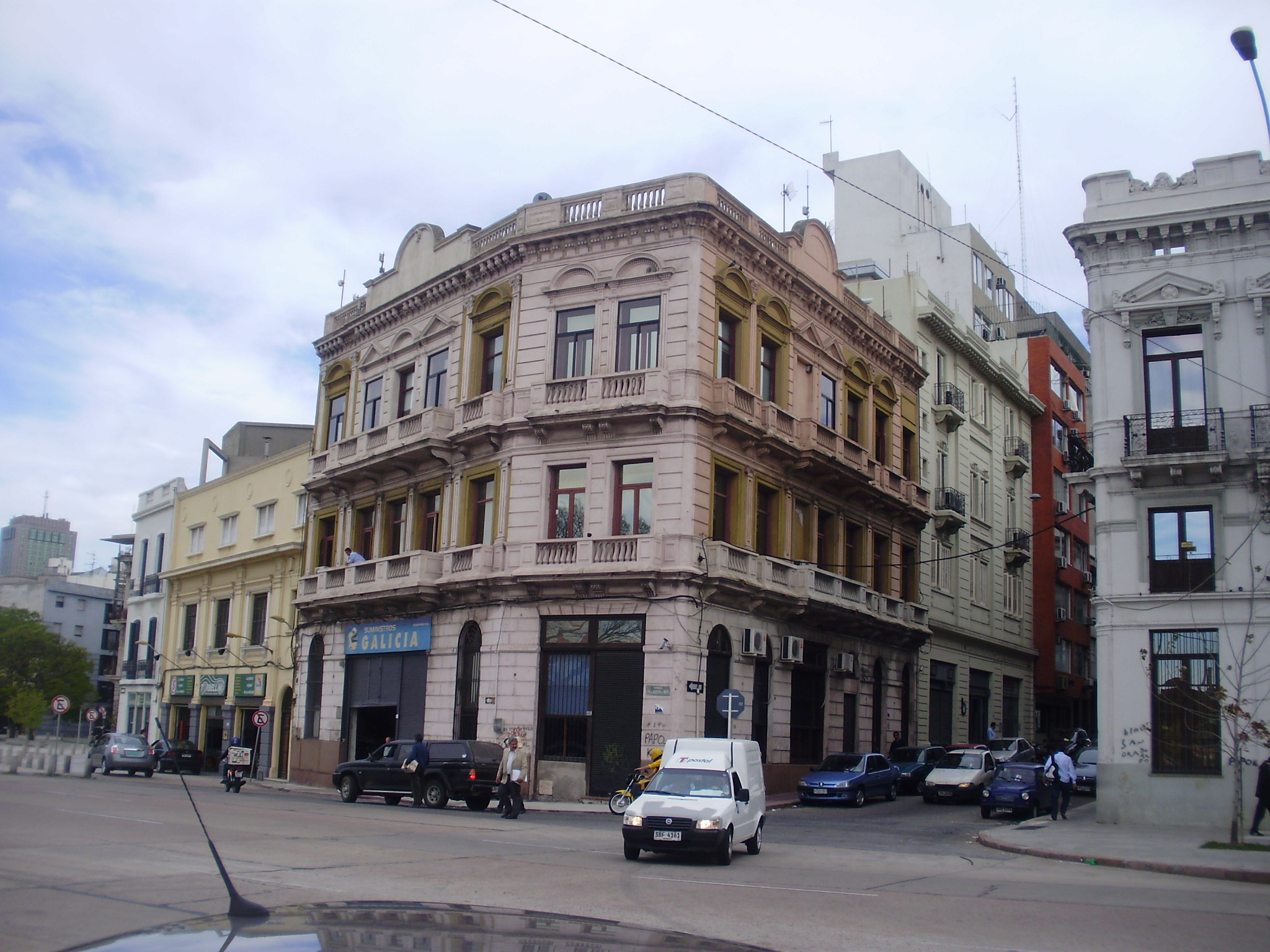 | Urbanística: | Edificio que resuelve contundentemente su situación de esquina, relacionándose con ambos tramos en los que se inserta, tanto en proporciones como en relaciones de llenos y vacíos. En cuanto a alturas, colabora en rematar visualmente el tramo de la Rambla 25 de Agosto de la manzana Nº42, funcionando como rótula con la menor escala de los edificios hacia la Plaza Garibaldi. Colabora en la definición de ese perfil, la forma trapezoidal del frente del padrón, escorzando su fachada sobre la mencionada plaza. |