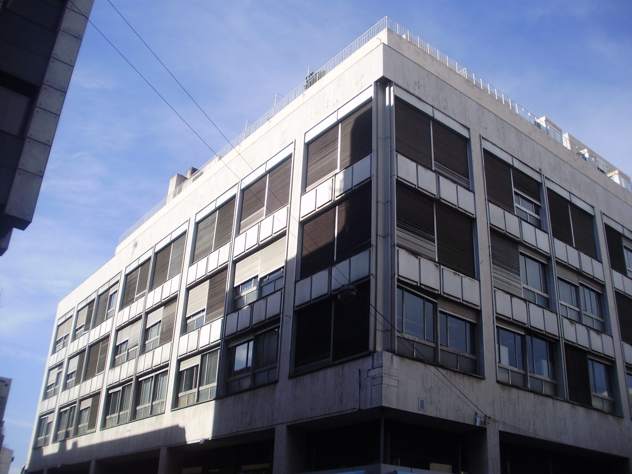 Edificio construido en 1962 destinado a actividades financieras y de oficina. Se resuelve en un volumen de siete niveles adoptando en fachada elementos lingüísticos de la arquitectura moderna. A su correcta inserción contribuyen el basamento retranqueado y el gálibo de tres niveles, la calidad constructiva y el manejo de las proporciones. Presenta planta baja y el entrepiso vidriado, en tanto las plantas altas alternan fajas horizontales opacas y vidriadas, interrumpidas por pilares que llegan a planta baja recomponiendo el plano de fachada en conjunto con una notable incorporación del elemento vegetal mediante jardineras horizontales que ofrecen movimiento a la planta baja. Su estado de conservación es bueno.