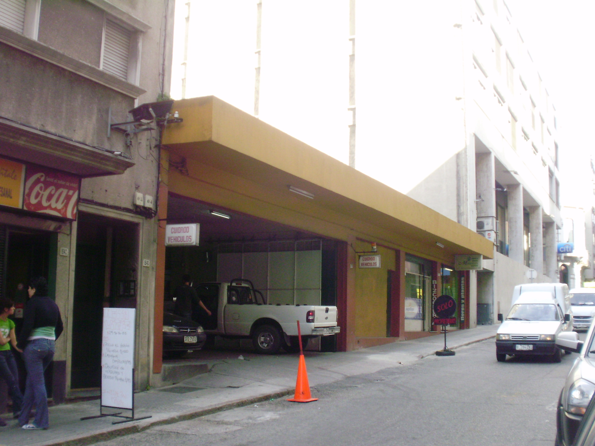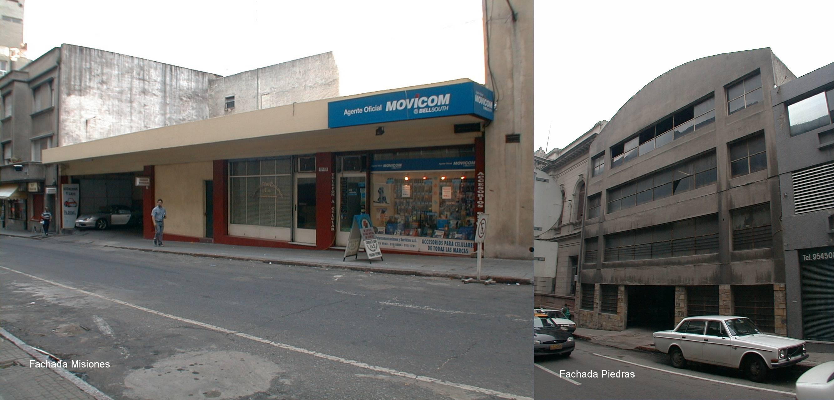 Edificio para estacionamiento construido entorno a 1970 en un padrón con frente a dos calles, Piedras y Misiones. Se desarrolla en cuatro y dos niveles respectivamente, albergando además en éstos últimos, en planta baja una oficina y un local comercial. Su inserción sobre la calle Misiones crea una fuerte discontinuidad debido a su baja altura. Sobre la calle Piedras, a pesar de la alineación, contrasta su formalización principalmente con su destacado lindero izquierdo. Sin embargo se encuentra sobe esta calle completamente tapiado, siendo su ingreso por Misiones.