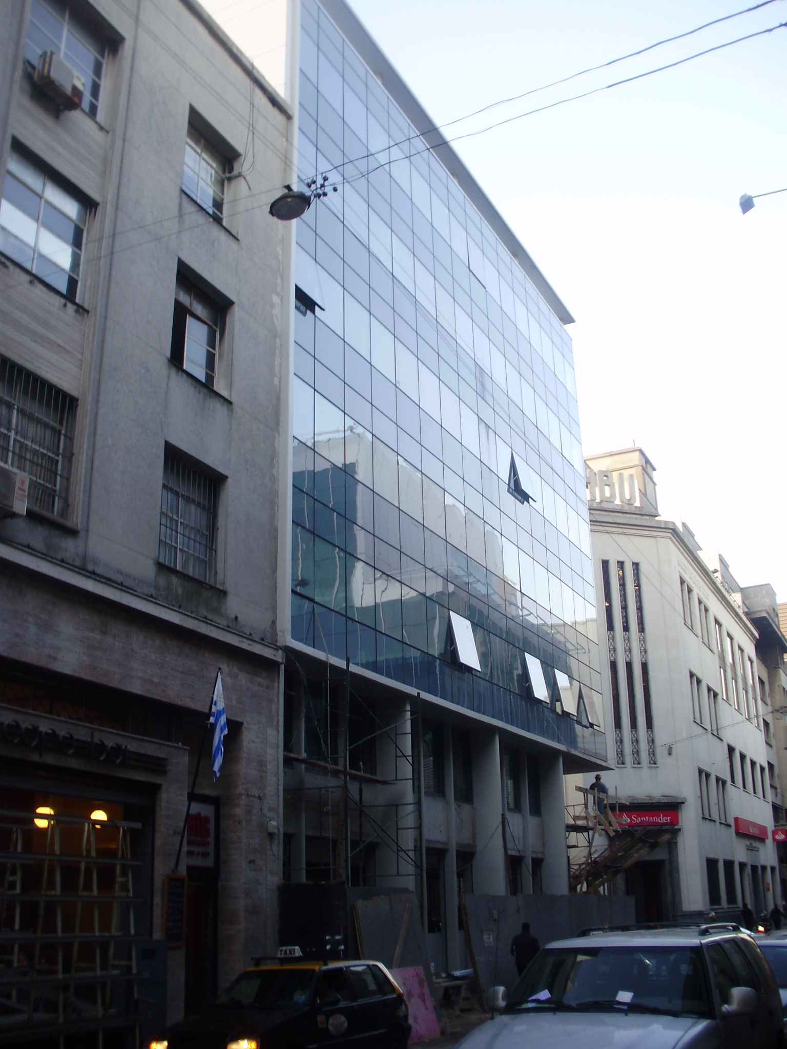 | Urbanística: | Sobre calle Treinta y Tres el edificio, aprovechando la diferencia de alturas y las características particulares de su lindero (subestación de UTE), transforma su medianera en fachada. Sobre 25 de Mayo dialoga correctamente con los edificios modernos de su entorno mediante su imagen contemporánea, en particular con la renovada fachada de muro cortina del edificio ubicado en la esquina en diagonal perteneciente al BROU (Div. Empresas - Ex Banco Brasil). |