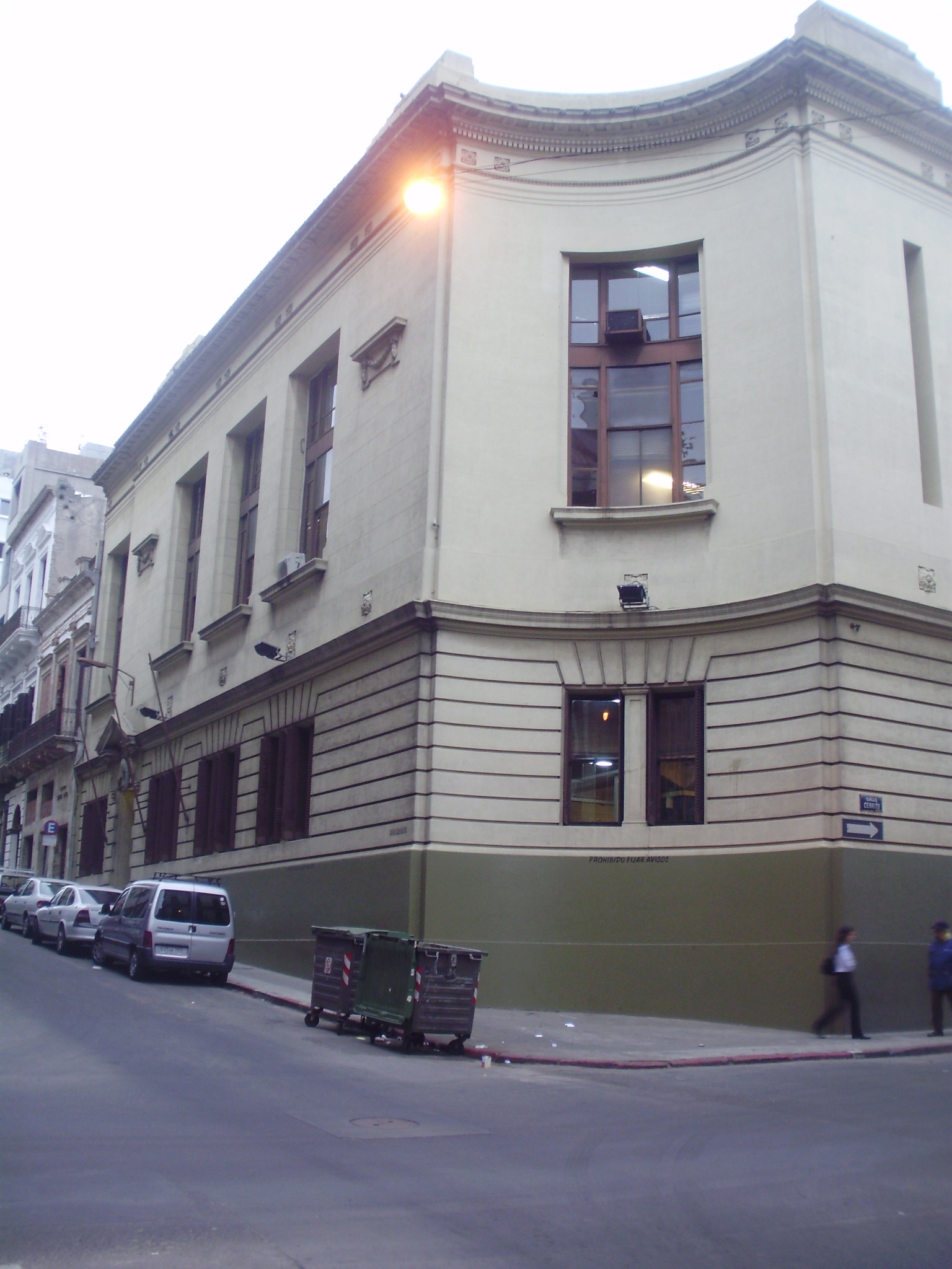 | Arquitectónica: | Edificio de carácter masivo y lineas sobrias, estructurado en torno a un patio que define la espacialidad interior, muy bien conservada. Las fachadas que a partir de la marcante ochava cóncava se despliegan sobre Cerrito y Treinta y Tres se organizan de forma tripartita, presentando un basamento almohadillado, un paño central despojado y predominantemente liso con vanos tratados como huecos en el muro, y una cornisa prominente, diferenciándose sólo los accesos por cada una de las calles. |