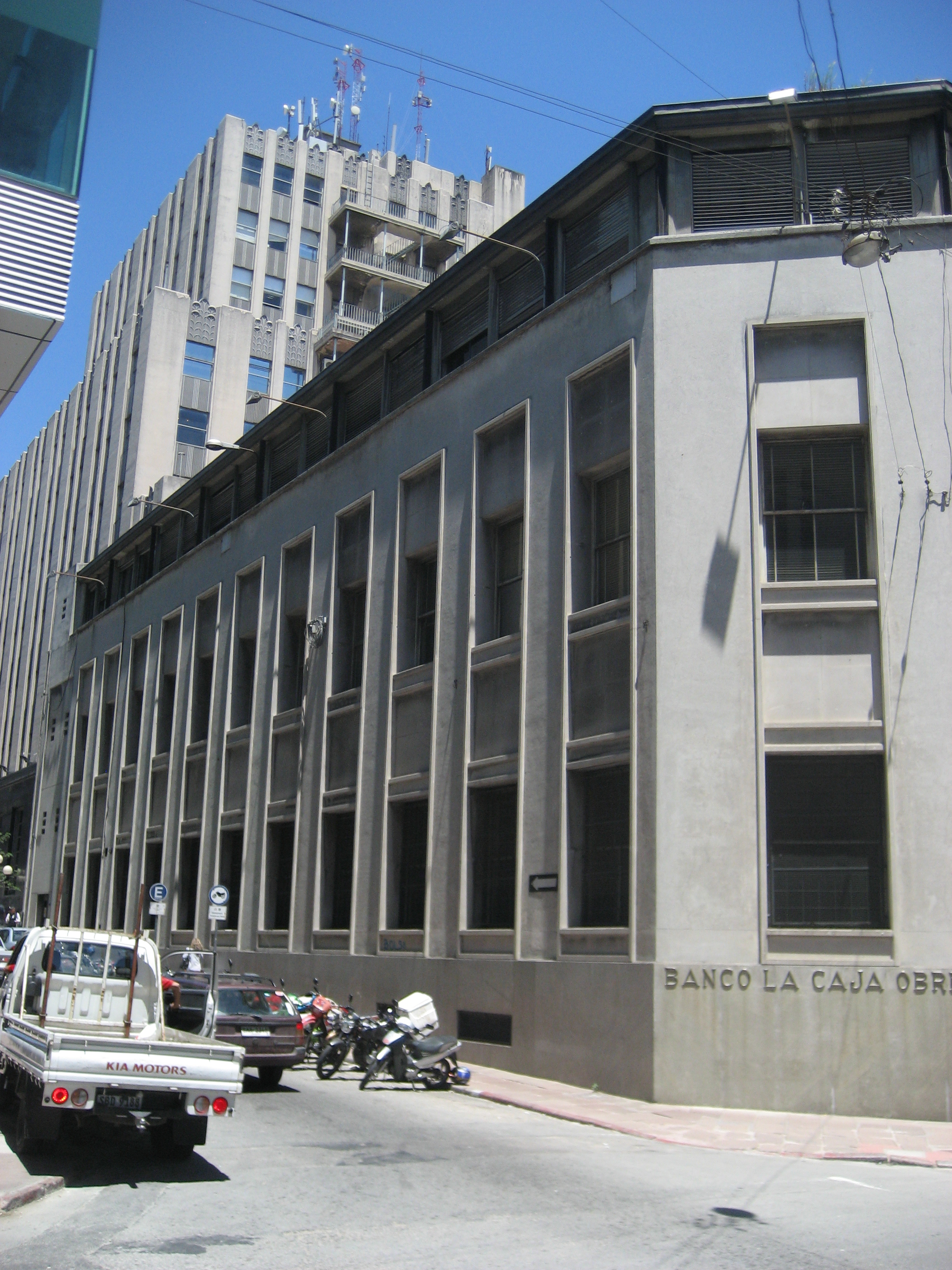 Edificio originalmente de dos niveles y subsuelo, construido a principios de siglo XX para la sede de La Caja Obrera, Banco de Ahorro y Crédito. Fue reformado en la década de 1940, trasladando el antiguo acceso sobre la calle Treinta y Tres, hacia 25 de Mayo. Años más tarde se amplía sobre 25 de Mayo y en la década de 1960 se agrega un tercer nivel. La importante masa del edificio organiza sus fachadas en paños verticales que contienen las aberturas, interrumpidos por el acceso en forma de pórtico, en el que se destacan tres bajorrelieves de mármol. El último nivel funciona como remate gracias al tratamiento liviano de las aberturas continuas. Se encuentra en buen estado de conservación.