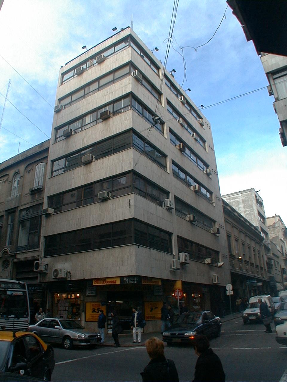 Edificio que por su mayor altura y tratamiento de fachada resulta ajeno al entorno, generando una discontinuidad de escala y calidad formal tanto en el tramo por 25 de Mayo como en el correspondiente a Misiones.