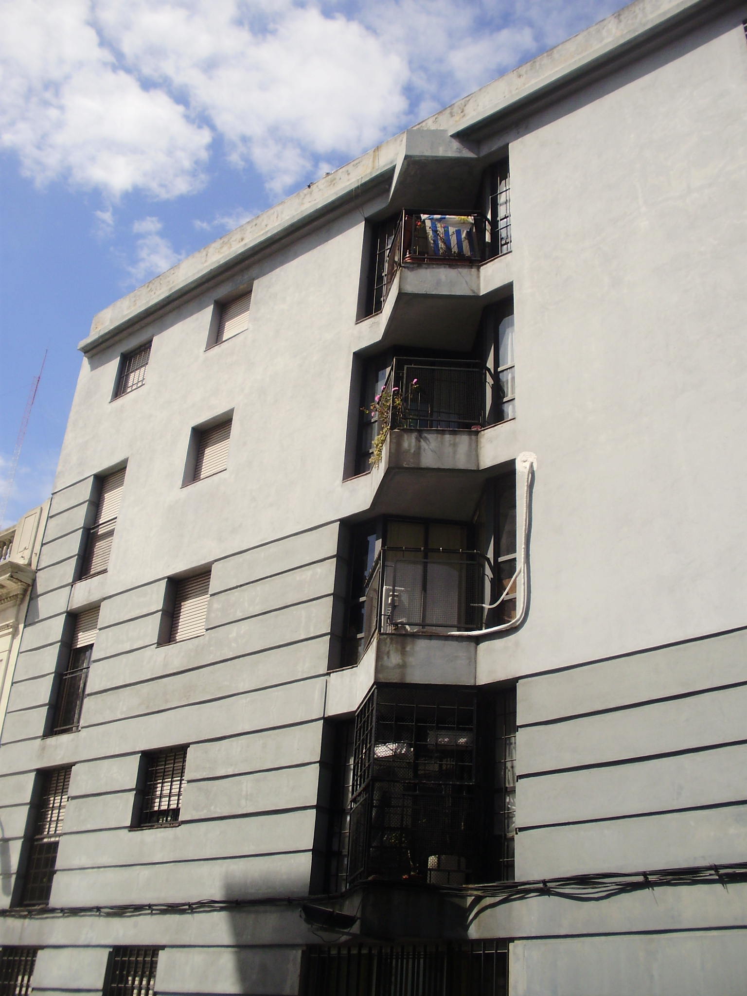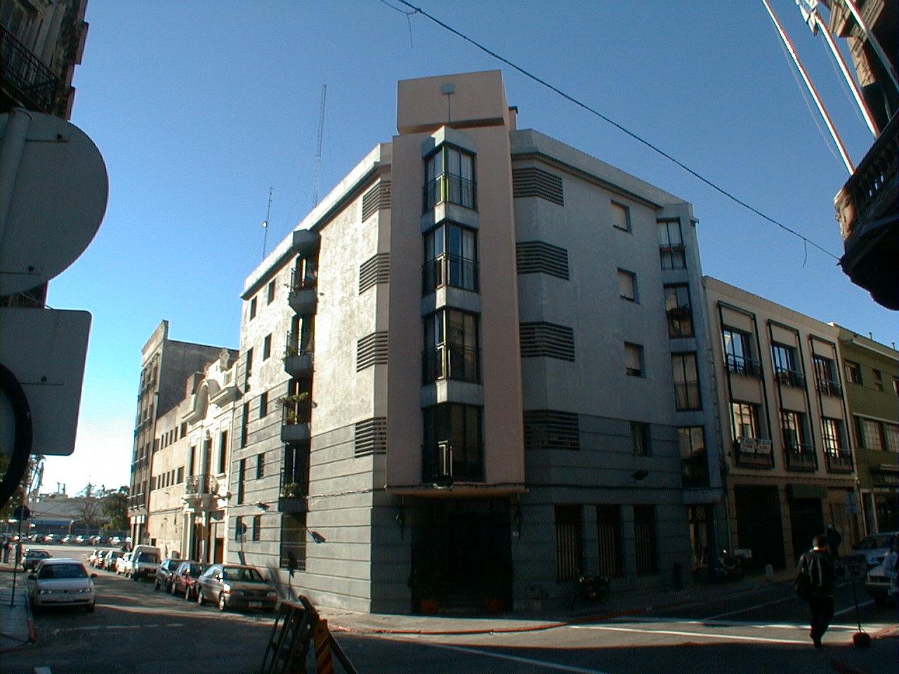 Edificio de viviendas en propiedad horizontal, construido en 1992, dentro de la política de estímulo a la construcción de vivienda nueva en la Ciudad Vieja. Su fachada maciza se resuelve con la utilización de elementos contextualistas como el basamento buñado, las proporciones de las aberturas y los balcones y salientes, tratados como bow-windows triangulares. Se otorga un tratamiento diferenciado a la esquina, resuelta como un volumen vertical que se independiza del cuerpo del edificio, haciendo referencia a los edificios de renta en esquina tan frecuentes en la zona central de la Ciudad Vieja. Se encuentra en buen estado de conservación.