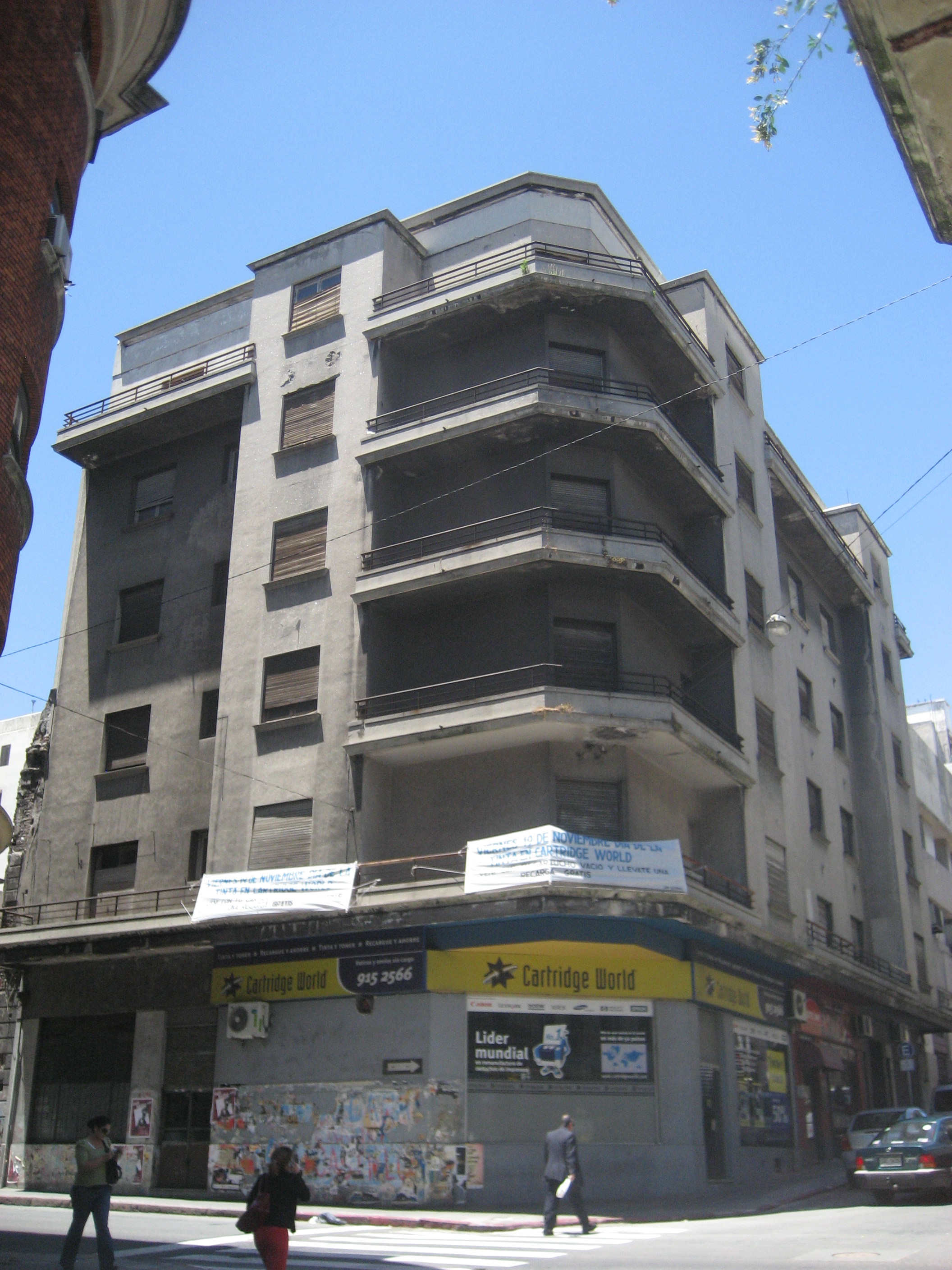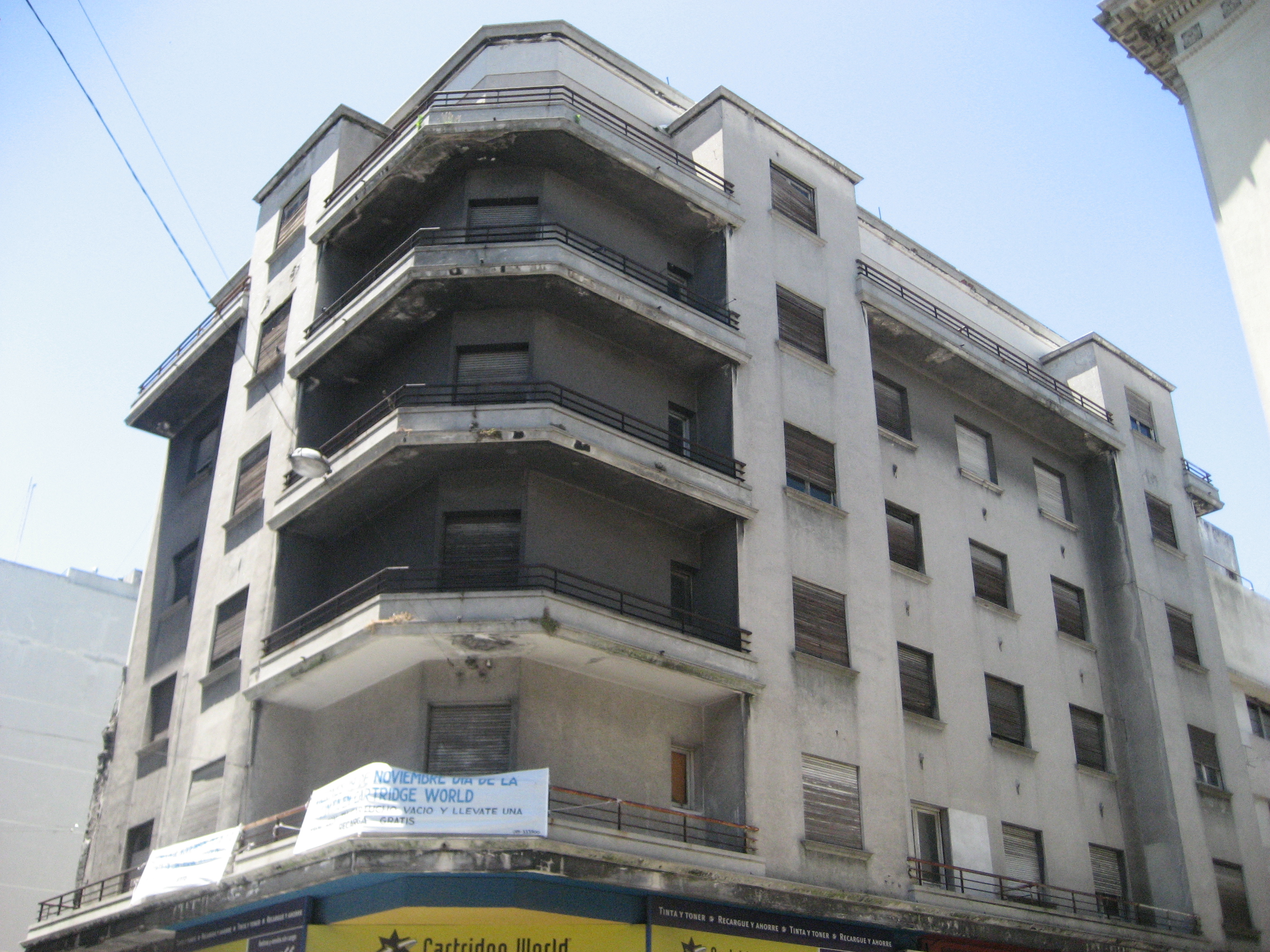 Edificio de renta construido a fines de la década de 1930, para uso de vivienda con locales comerciales y oficinas en planta baja. Apela al lenguaje de la arquitectura racionalista, trabajando con cuerpos salientes verticales y balcones con barandas de hierro, que destacan ochavados sobre la esquina. El edificio se encuentra totalmente desocupado en sus niveles superiores, pese a lo cual no se detectan, al menos exteriormente, problemas graves de conservación.
