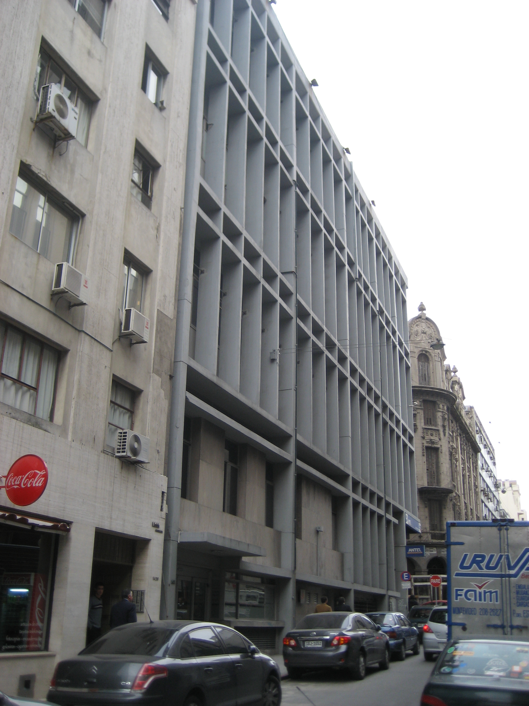 Edificio construido entre los años 1960 y 1980 para albergar dependencias de ANTEL. La construcción ocupa tres padrones y se desarrolla con un subsuelo, planta baja y cuatro niveles. Internamente desarrolla el área de servicios y circulaciones en el padrón 3263, mientras que el resto es resuelto como plantas libres. La fachada, con la misma formalización del padrón 3264 de la esquina, recurre al lenguaje racionalista, mediante el uso de módulos de hormigón visto con fuerte relieve y verticalización. El edificio no ha sufrido modificaciones posteriores, conservándose en buen estado. Se inserta en un sector con claro perfil financiero, heterogéneo en lenguaje, altura y edad de las construcciones.