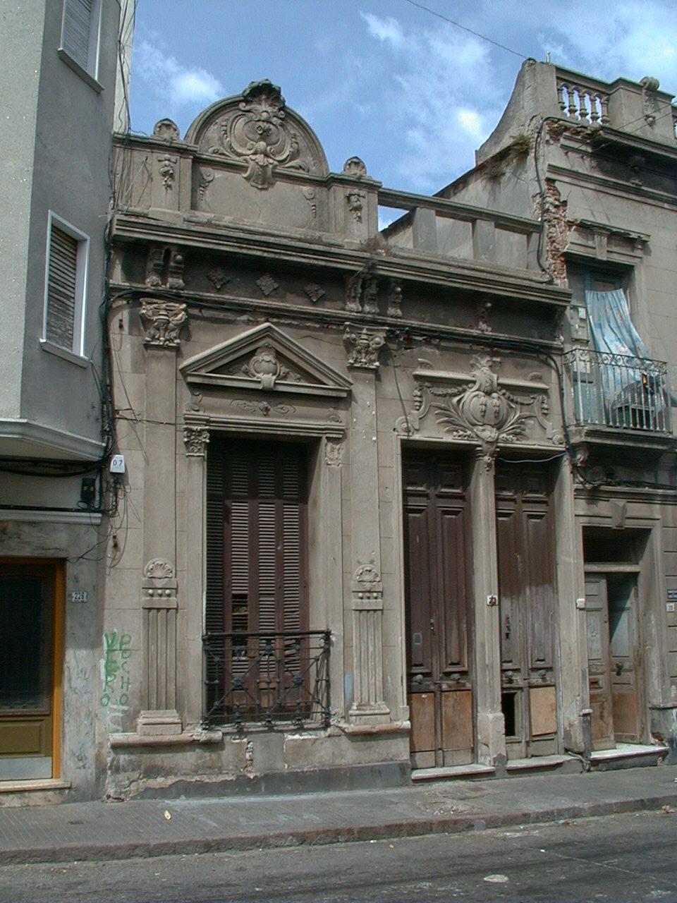 Padrón ocupado por dos edificios independientes construidos a principios del siglo XX, para uso residencial, que actualmente se encuentran desocupados y tapiados. La lectura de fachada denota claras diferencias en la altura, proporción de vanos y recursos estilísticos de cada uno de ellos. En el edificio ubicado en el sector A, hacia Pérez Castellano, desarrollado en un solo nivel, se ubicaba una vivienda al frente y varios apartamentos al fondo, a los que se accedía por un corredor lateral. La fachada presenta una rica ornamentación que combina elementos del repertorio clásico como el frontón y las pilastras, con figuras vegetales. Se desconoce el estado de conservación del interior, en tanto el exterior, a pesar del tapiado de las aberturas, mantiene casi totalmente sus características originales.