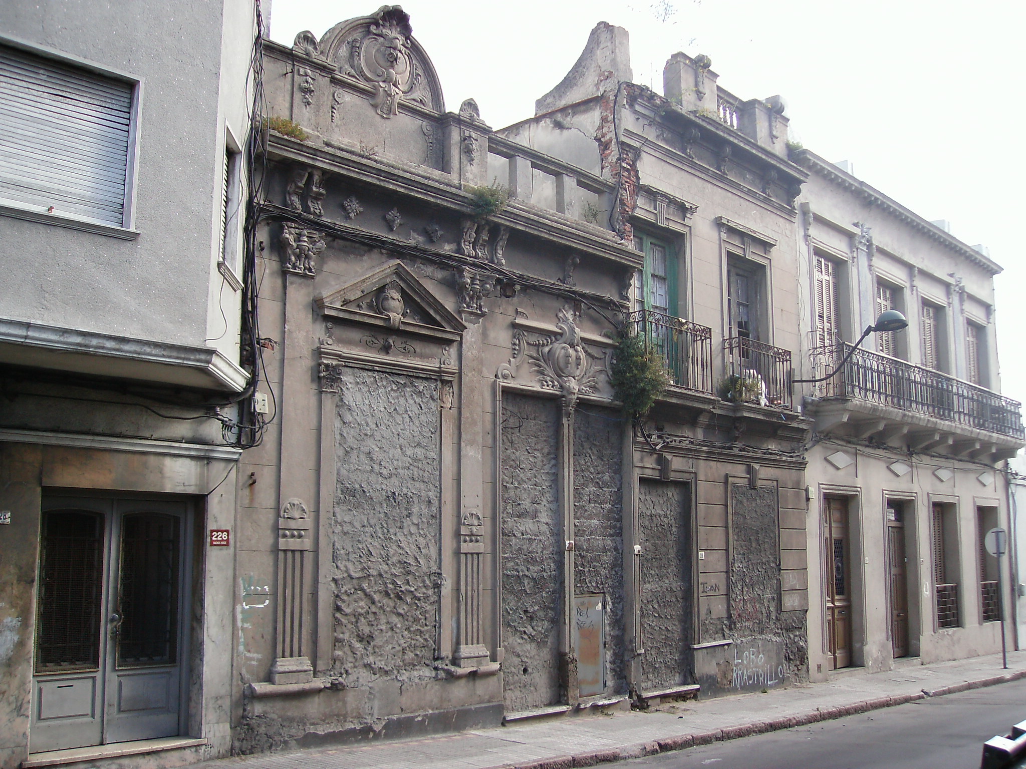 Padrón ocupado por dos edificios independientes construidos a principios del siglo XX, para uso residencial, que actualmente se encuentran desocupados y tapiados. La lectura de fachada denota claras diferencias en la altura, proporción de vanos y recursos estilísticos de cada uno de ellos. En el edificio ubicado en el sector B, hacia Maciel, se alojaba una vivienda unifamiliar de dos niveles. Su fachada, de resolución más simple que la del otro sector, presenta aberturas enmarcadas con chambranas y dovelas, balcones de herrería y un pretil con balaustres. En el exterior se constatan importantes fisuras y desprendimientos de revoque, en tanto se desconoce el estado de conservación interior.