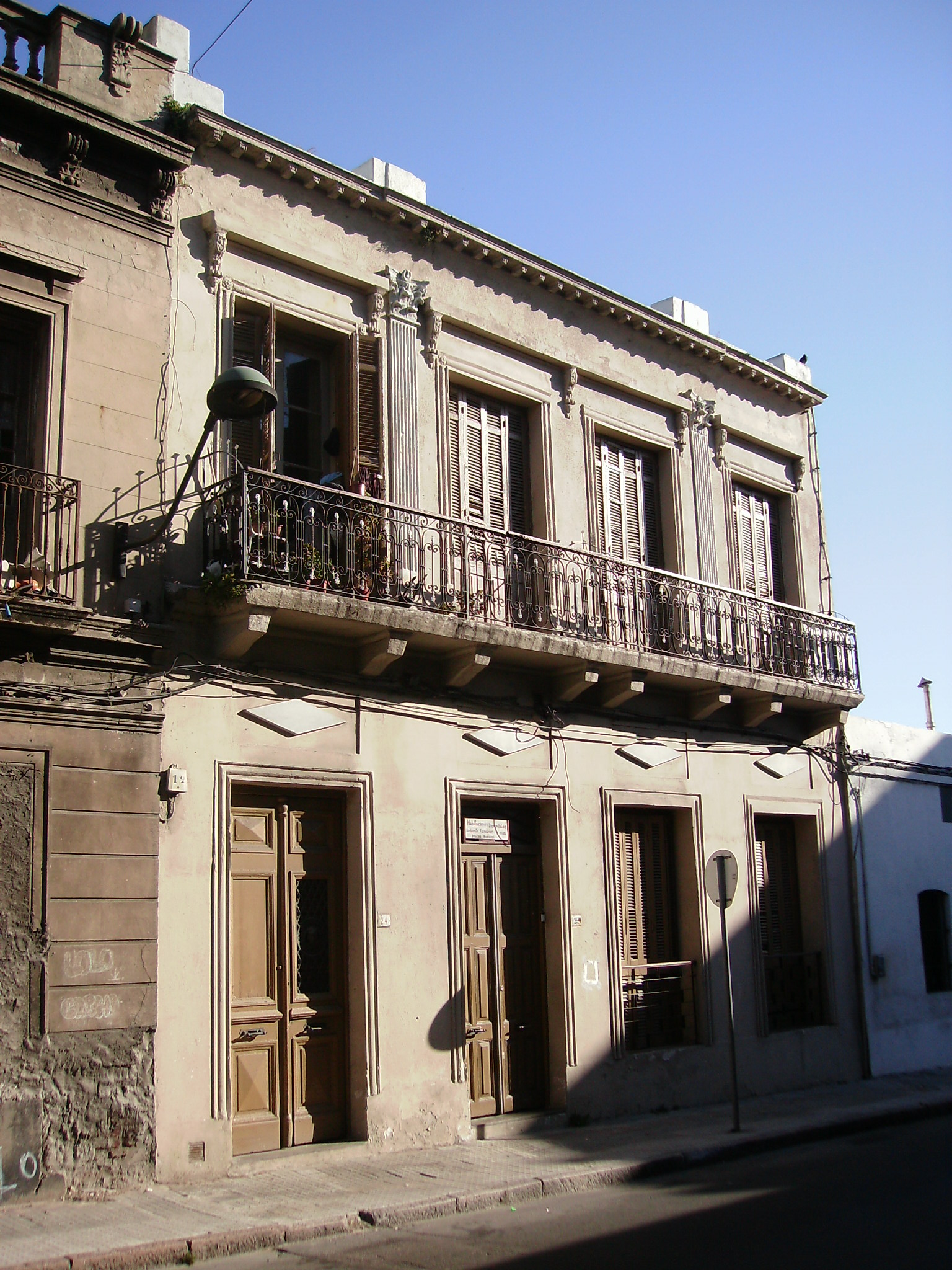 Edificio construido en la segunda mitad del siglo XIX, desarrollado en dos niveles, que originalmente albergaba una vivienda en cada uno de ellos. Posteriormente fueron agregadas construcciones en el sector posterior, y se adaptó para utilizarse como pensión, unificándose las dos unidades mediante la eliminación de parte del muro del hall de acceso. Su fachada se caracteriza por el ritmo y la delicada decoración concentrada fundamentalmente en la planta alta. En ella se destaca la presencia del balcón corrido de herrería y de las pilastras y guardapolvos que coronan los vanos, así como de los canecillos que formaban parte del remate, del cual se ha perdido el pretil. El edificio se encuentra en buen estado de conservación exterior, pero el interior requiere operaciones de mantenimiento.