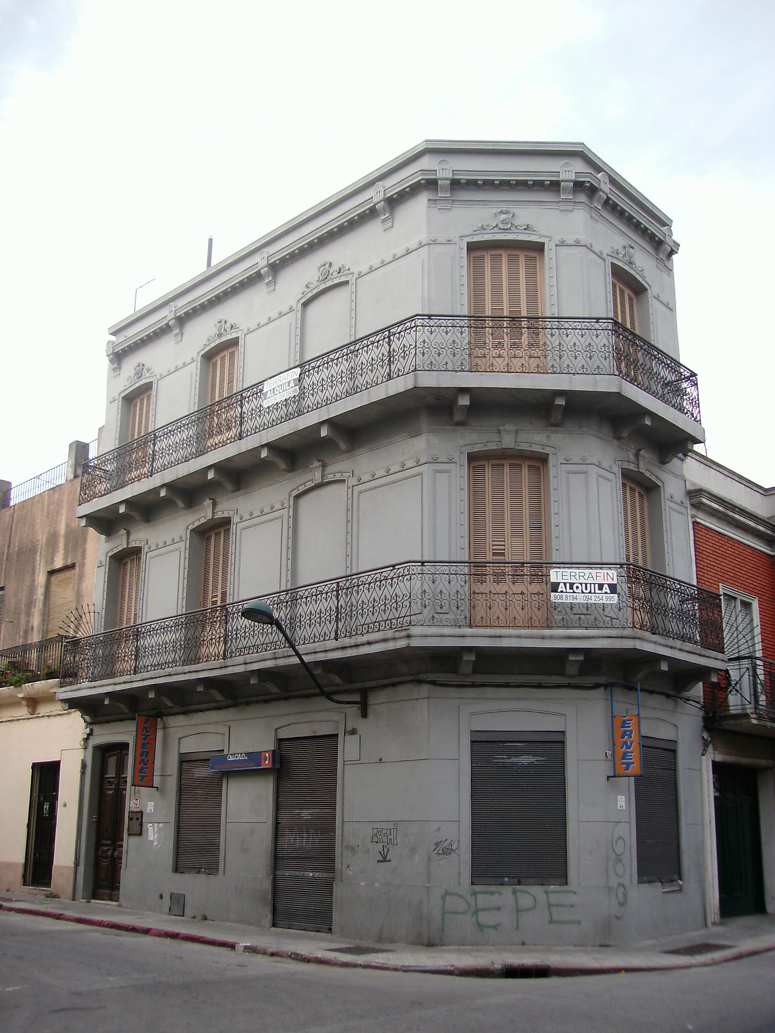 Edificio construido a fines del siglo XIX, desarrollado en tres niveles, que alojaba comercios en planta baja y apartamentos en los pisos superiores. En el año 2004 fue reciclado y se recuperó su fachada en el marco del programa “Ciudad Vieja Renueva”. La misma presenta un sencillo basamento que ha sido parcialmente modificado, y un desarrollo caracterizado por la presencia de vanos coronados por arcos escarzanos enmarcados en chambranas decoradas y de dos importantes balcones continuos de trabajada herrería. El edificio se encuentra desocupado y en buen estado de conservación exterior.