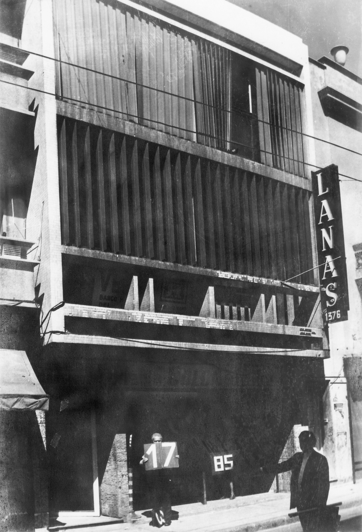 | Arquitectónica: | Buen ejemplo de arquitectura moderna de la década de 1950, cuya diseñada fachada está caracterizada por un volumen saliente revestido en pastillas de gres que abarca las plantas altas, en el que se destacan dos importantes fajas de parasoles verticales. La falta de mantenimiento general así como el diseño de la cartelería, empobrecen la imagen del edificio, que se encuentra en regular estado de conservación.