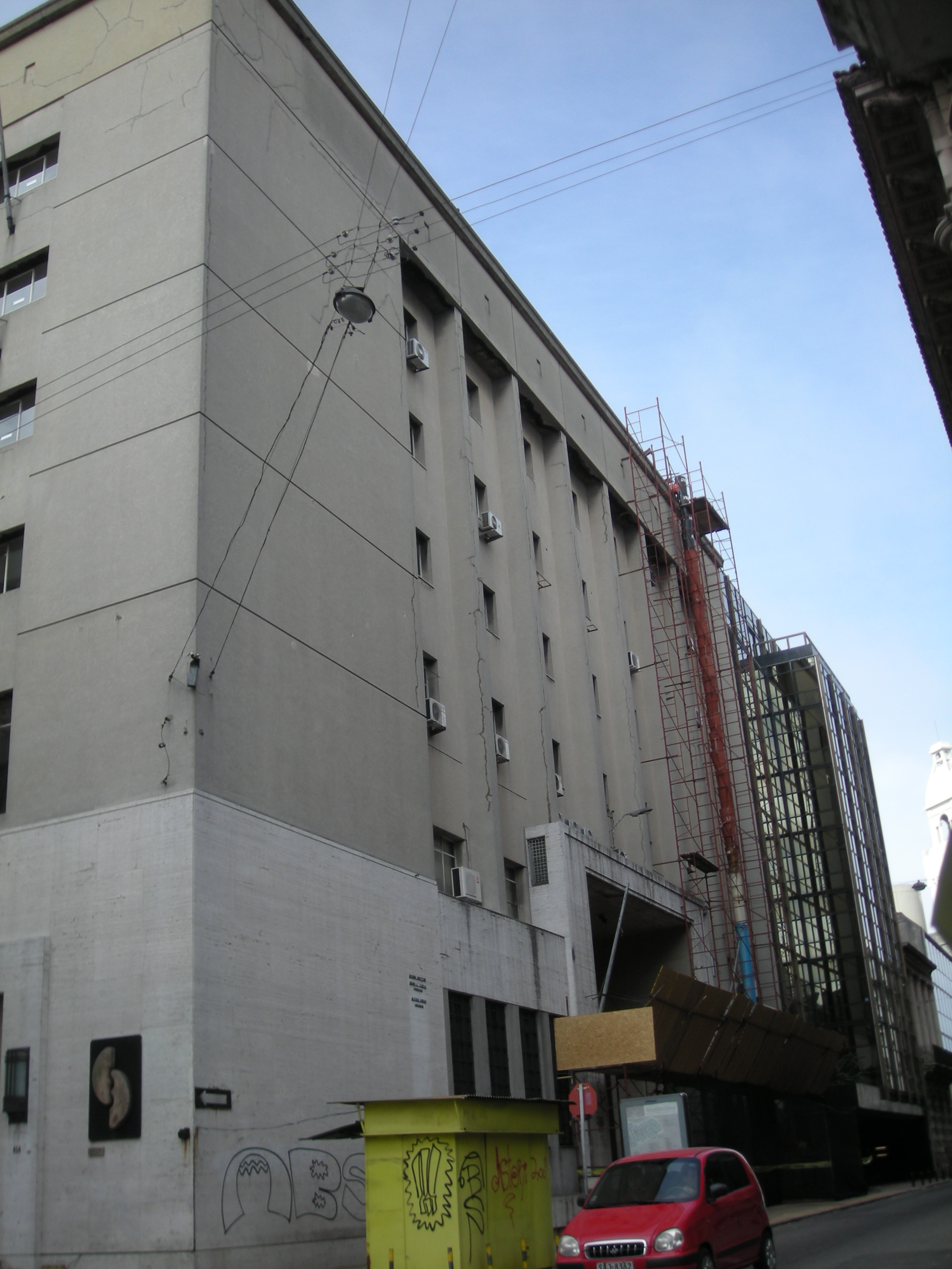 Edificio construido en torno a 1940, producto de un concurso de arquitectura, para albergar la Bolsa de Comercio. Se desarrolla en seis niveles en torno a un patio central cubierto. Su formalización, característica de los edificios representativos de la época, se manifiesta a través de la pureza volumétrica y la búsqueda de la monumentalidad. Presenta una fachada compacta con vanos a modo de perforaciones en el muro, jerarquizando el acceso principal por medio de un gran portal. El edificio se mantiene en buen estado de conservación.