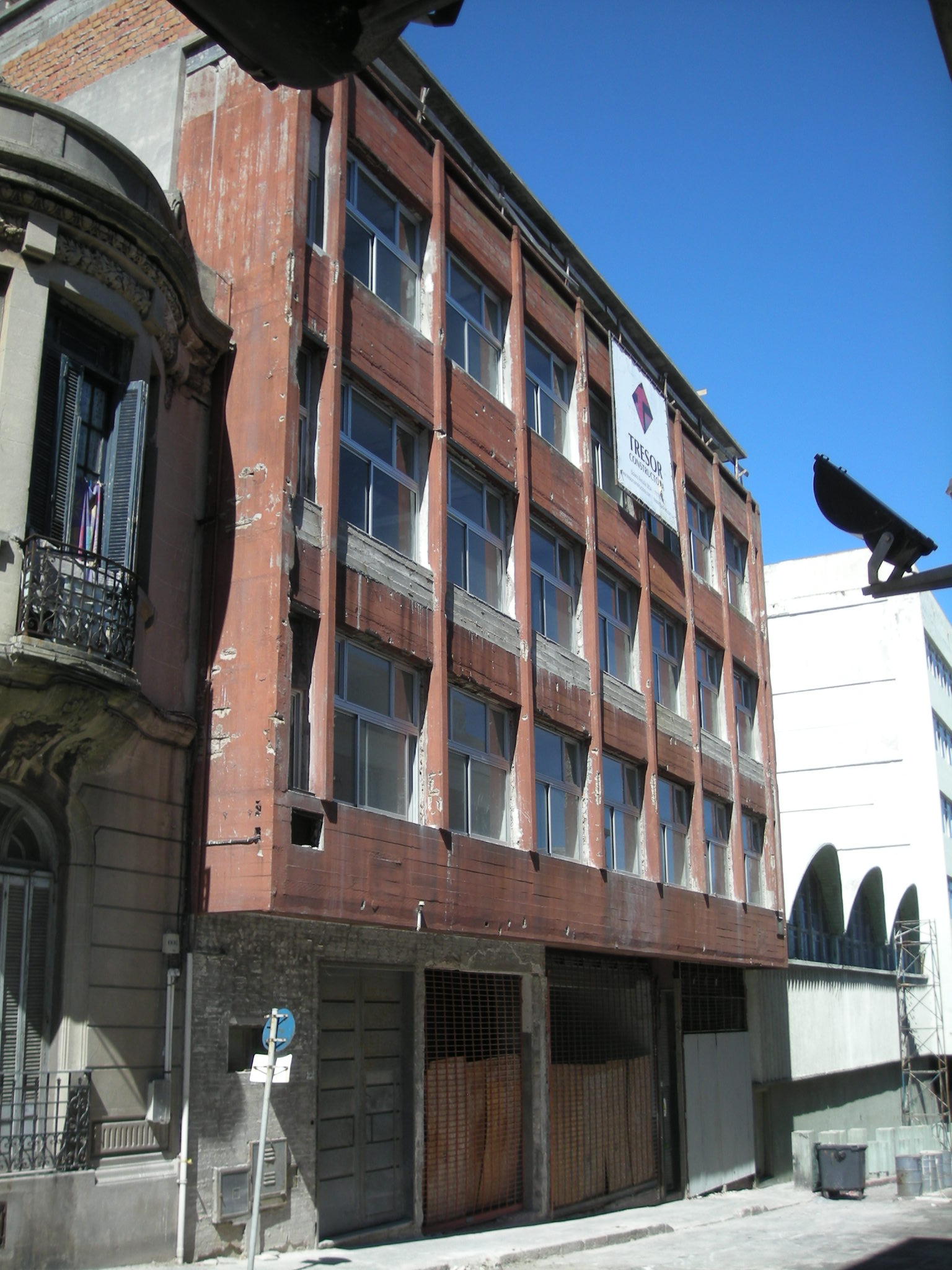 | Arquitectónica: | Edificio determinado por ventaneo horizontal interrumpido por pilares de fuerte presencia formal. Sin especiales valores a destacar. |
