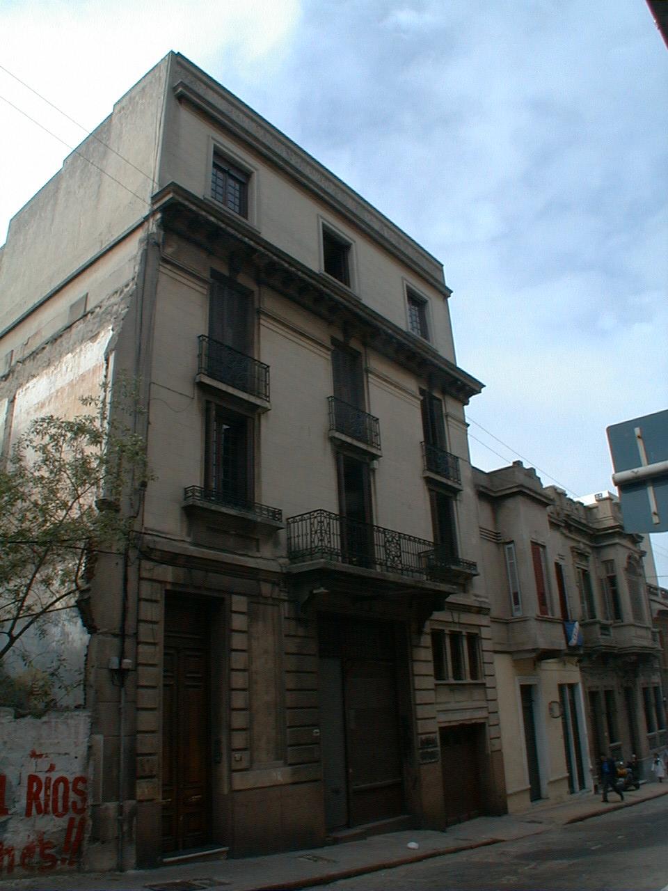 Predio producto de la unificación de dos padrones, uno de los cuales se encuentra baldío. En el otro se ubica un edificio construido a principios del siglo XX, originalmente desarrollado en planta baja de uso comercial y dos niveles destinados a vivienda, hoy desocupado. La fachada consta de un basamento buñado, un cuerpo central de composición simétrica con vanos y balcones forjados, que remata en una cornisa con ménsulas ornamentadas. Sobre ella se agregó con posterioridad un piso, respetando los lineamientos generales del original. Su estado de conservación es bueno.
