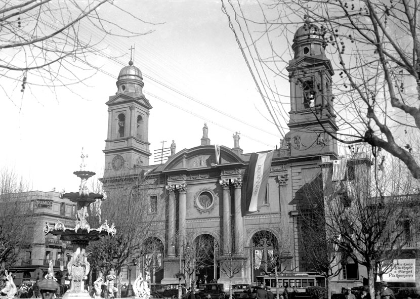 Fachadas. Cúpulas sobre campanarios revestidas con azulejos. Presbiterio y cátedra. Esculturas de fachada de José Belloni. Esculturas interiores.