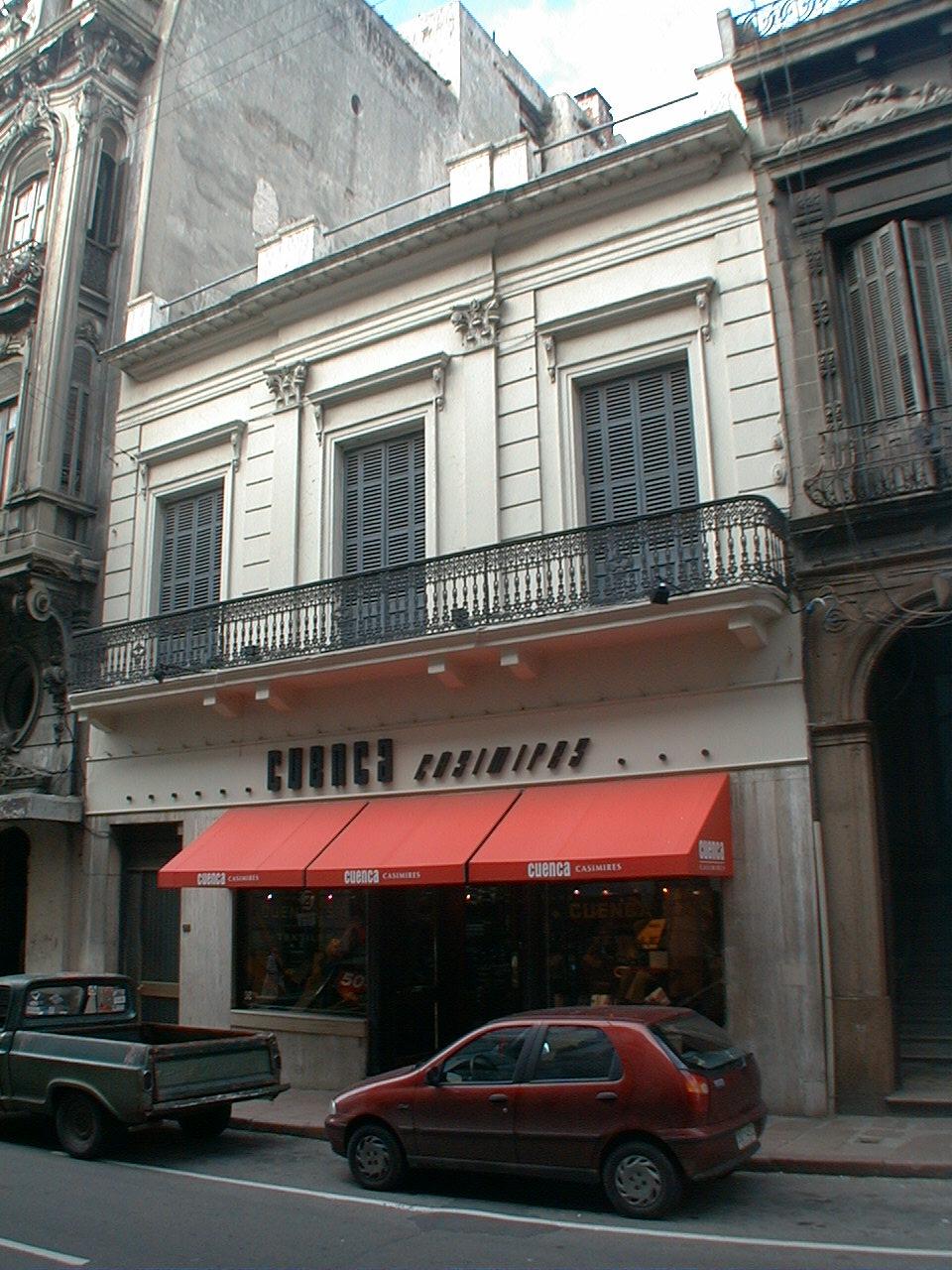 Edificio de vivienda con planta baja comercial construido a fines del siglo XIX. Fue ampliado hacia 1900 en zona posterior, alterando la organización interna, estructural, de cubiertas y de fachada en planta baja. Actualmente esta última se encuentra modificada respecto al año 2000, habiéndose incorporado una sub-estación de UTE, la puerta de acceso para el estacionamiento del personal del BID y retirado el revestimiento de mármol. El edificio conserva sin embargo su fachada en planta alta, compuesta por un balcón corrido con baranda en hierro fundido, tres aberturas (de las que se destaca la central enmarcada por pilastras corintias) y una cornisa y pretil con herrería como remate. Se encuentra en buen estado de conservación.