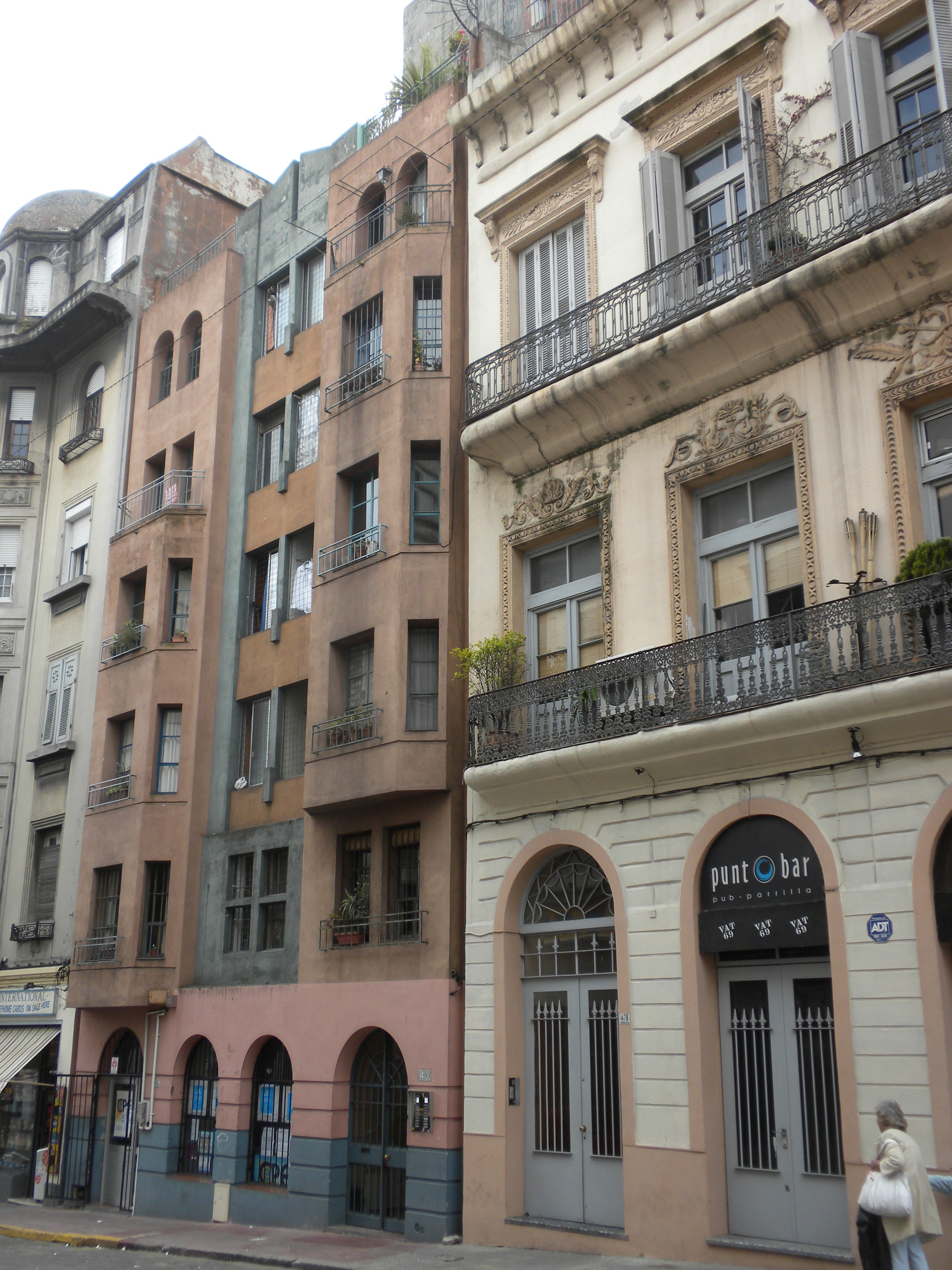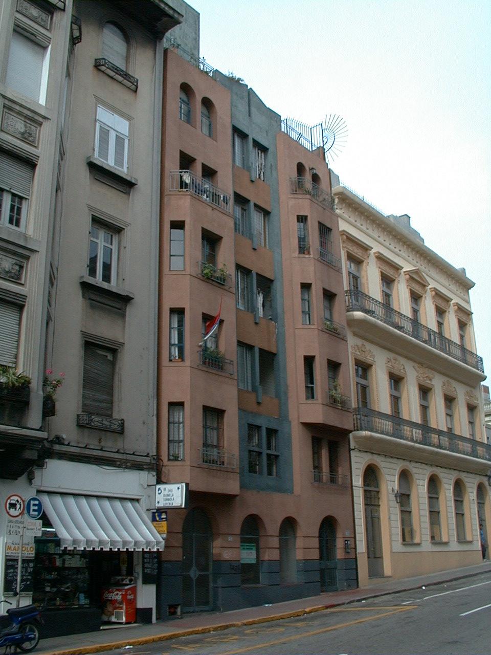 Edificio construido en 1989. Se desarrolla en seis niveles ocupando el frente y fondo de la parcela, con un patio interior. La fachada procura interpretar en lenguaje contemporáneo los elementos formales del entorno, siendo ejemplo del denominado "contextualismo", un modo de operar con cierto consenso en los años en que se realiza la obra. Presenta dos volúmenes salientes en los laterales de las plantas altas, una planta baja con una sucesión de vanos con arcos de medio punto y un remate con pretil de baranda de hierro y paño ligeramente triangular en el centro. Se encuentra en buen estado de conservación aunque evidencia la falta de mantenimiento y la baja calidad de sus terminaciones.