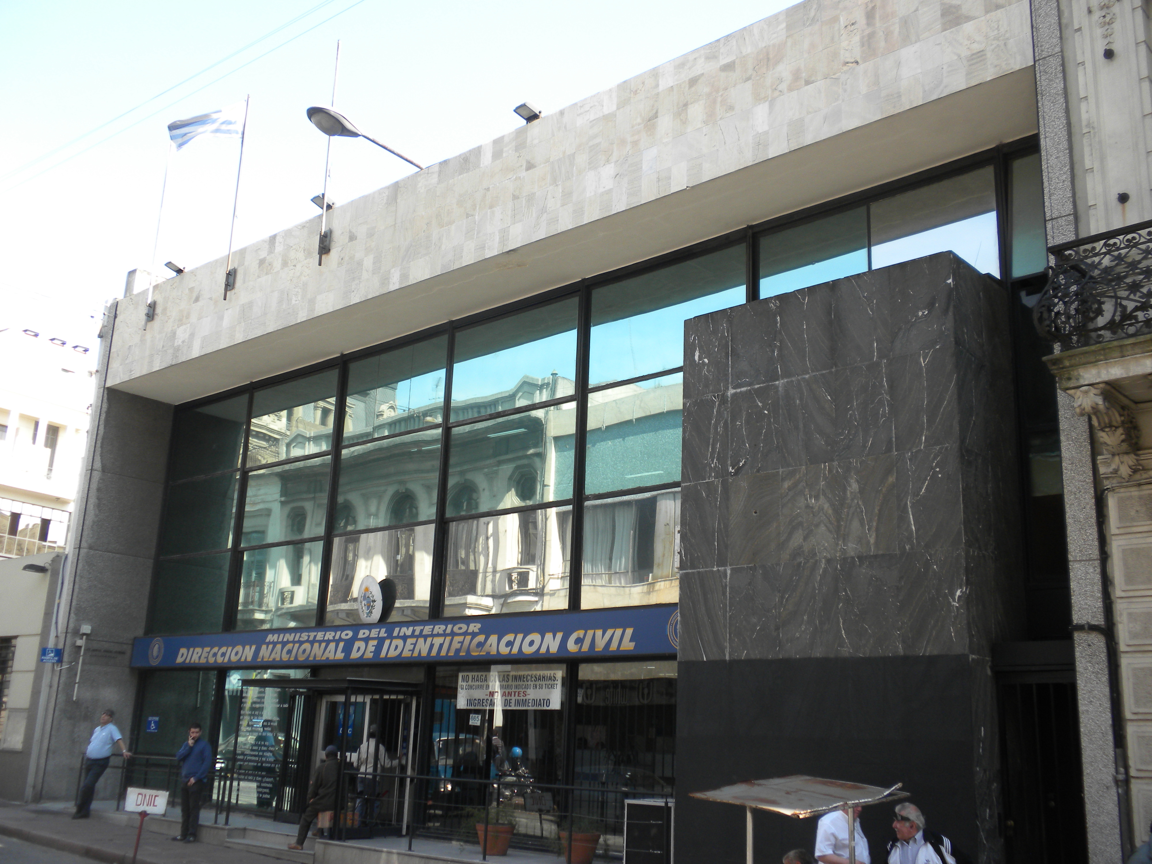 Edificio construido en la década de 1970 para actividades financieras, que actualmente alberga las instalaciones de la Dirección Nacional de Identificación Civil. Está básicamente conformado por un volumen vidriado de doble altura algo retirado y un marco que lo envuelve y que coincide con la línea de edificación. Dentro del plano vidriado, se inserta y sobresale el prisma macizo de la escalera revestido en mármol. En el interior, la resolución es de una planta libre con un entrepiso que se retira del plano vidriado y balconea el espacio. Se encuentra en buen estado de conservación.