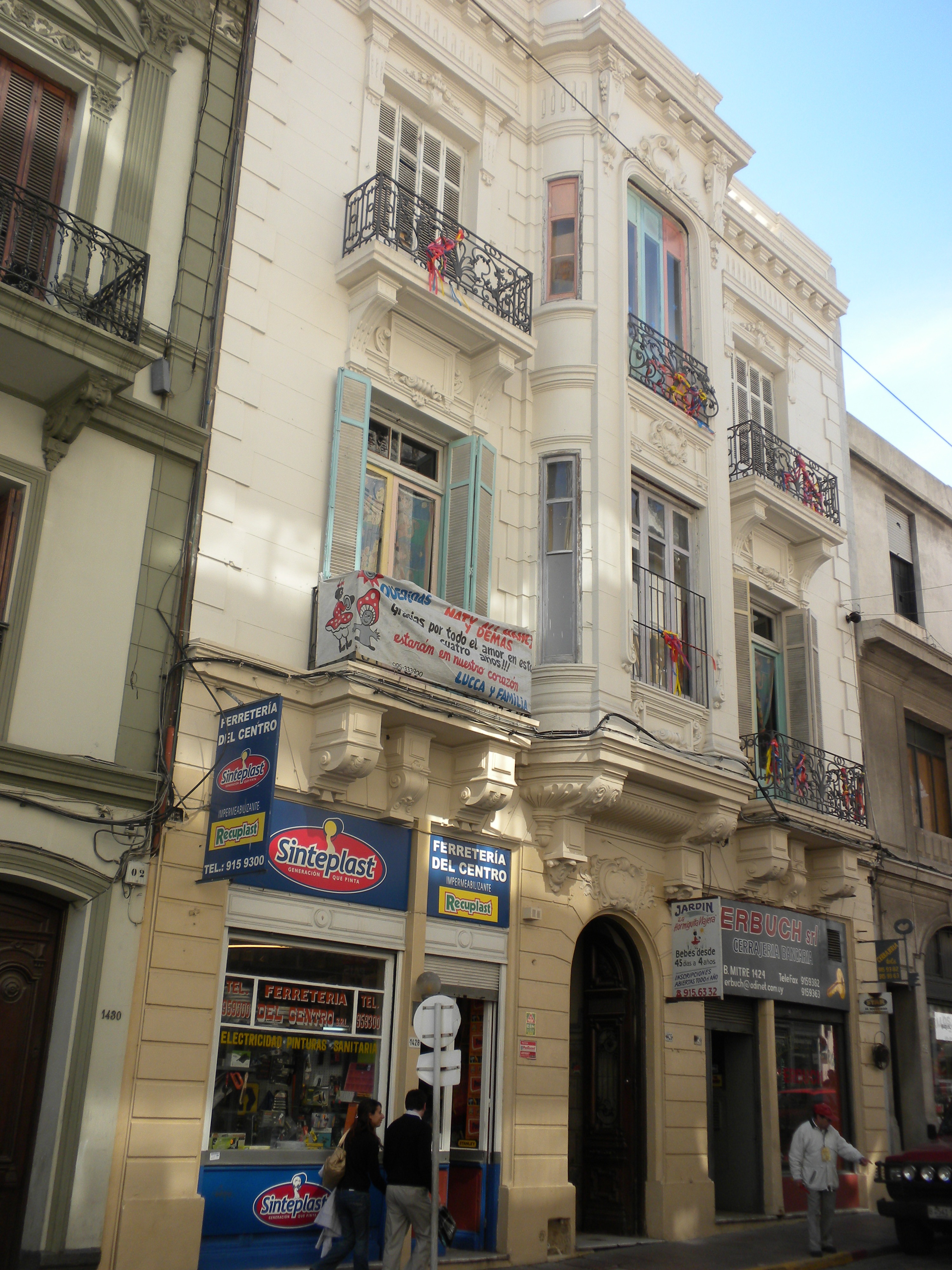 Edificio de vivienda de base comercial construido a principios de siglo XX. Se desarrolla en tres niveles, de los cuales la planta baja presenta dos locales comerciales, mientras las plantas altas son ocupadas por un jardín de infantes. El mismo se nuclea en torno a un gran patio central al cual se accede por un ornamentado hall en el que destaca la escalera de mármol. Se inscribe dentro de un eclecticismo propio de la época, con algunos detalles influenciados por el Art Nouveau. El edificio ha sido despojado de parte de su ornamentación original. Se encuentra en buen estado de conservación y forma un conjunto de interés con sus linderos.
