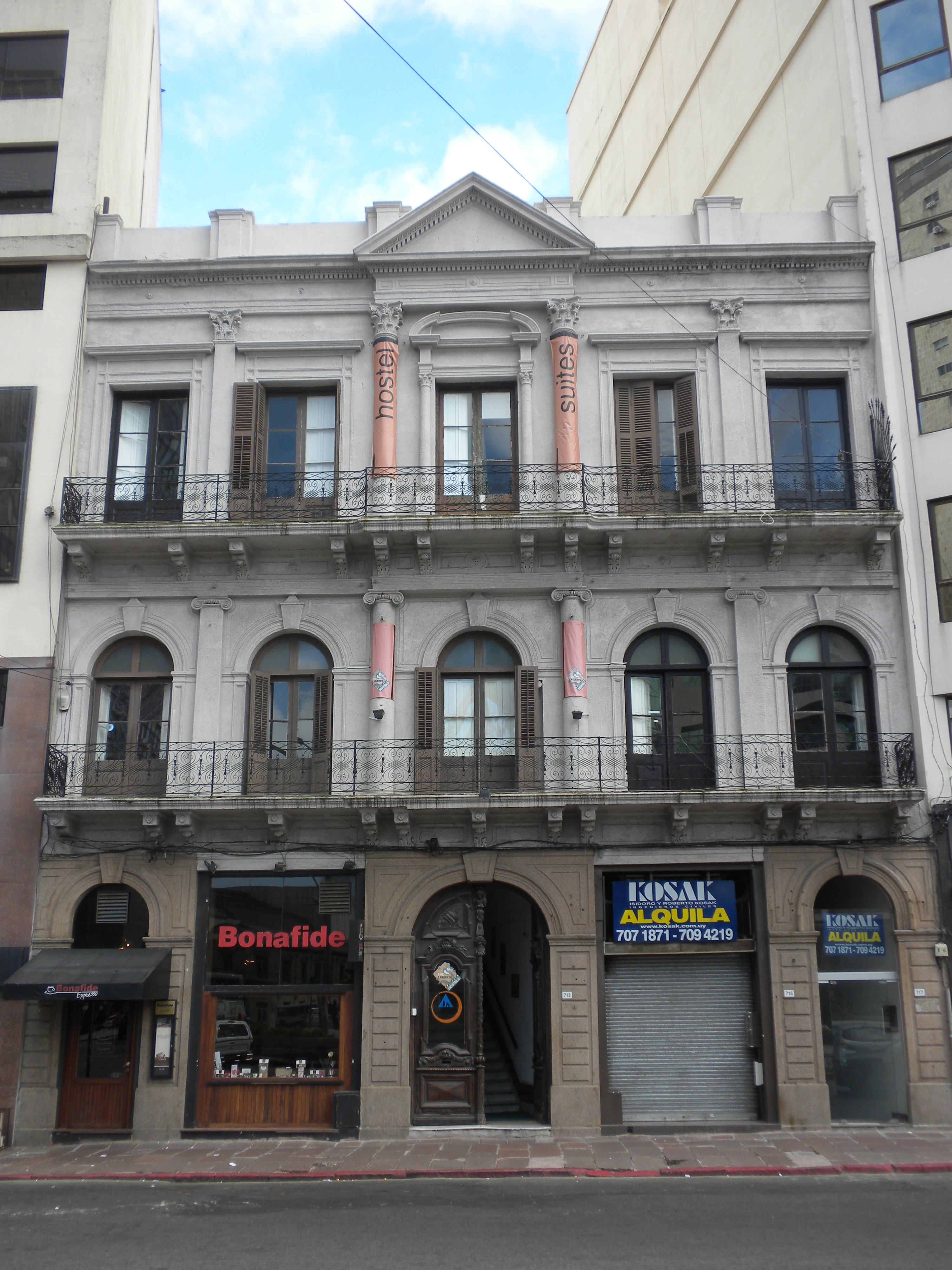 Edificio construido a fines del siglo XIX. Es uno de los pocos edificios de esta época que aún se conservan sobre la Plaza Independencia. Se desarrolla en tres niveles y subsuelo. Es difícil determinar su uso original pero pudo estar destinado a un gran comercio en planta baja y subsuelo y a hotel sus plantas altas. En 2006-2007 se realizó un reciclaje del edificio. Actualmente posee dos locales comerciales (uno de ellos desocupado) mientras que las plantas altas funciona un hostal. El edificio cuenta con múltiples elementos de significación, principalmente su distribución interna que genera un patio central con claraboya. Su fachada maneja una composición clásica, jerarquizando un eje de simetría central por un frontón triangular flanqueado por pilastras corintias en el segundo piso y dóricas en el primero. Se encuentra en buen estado de conservación.