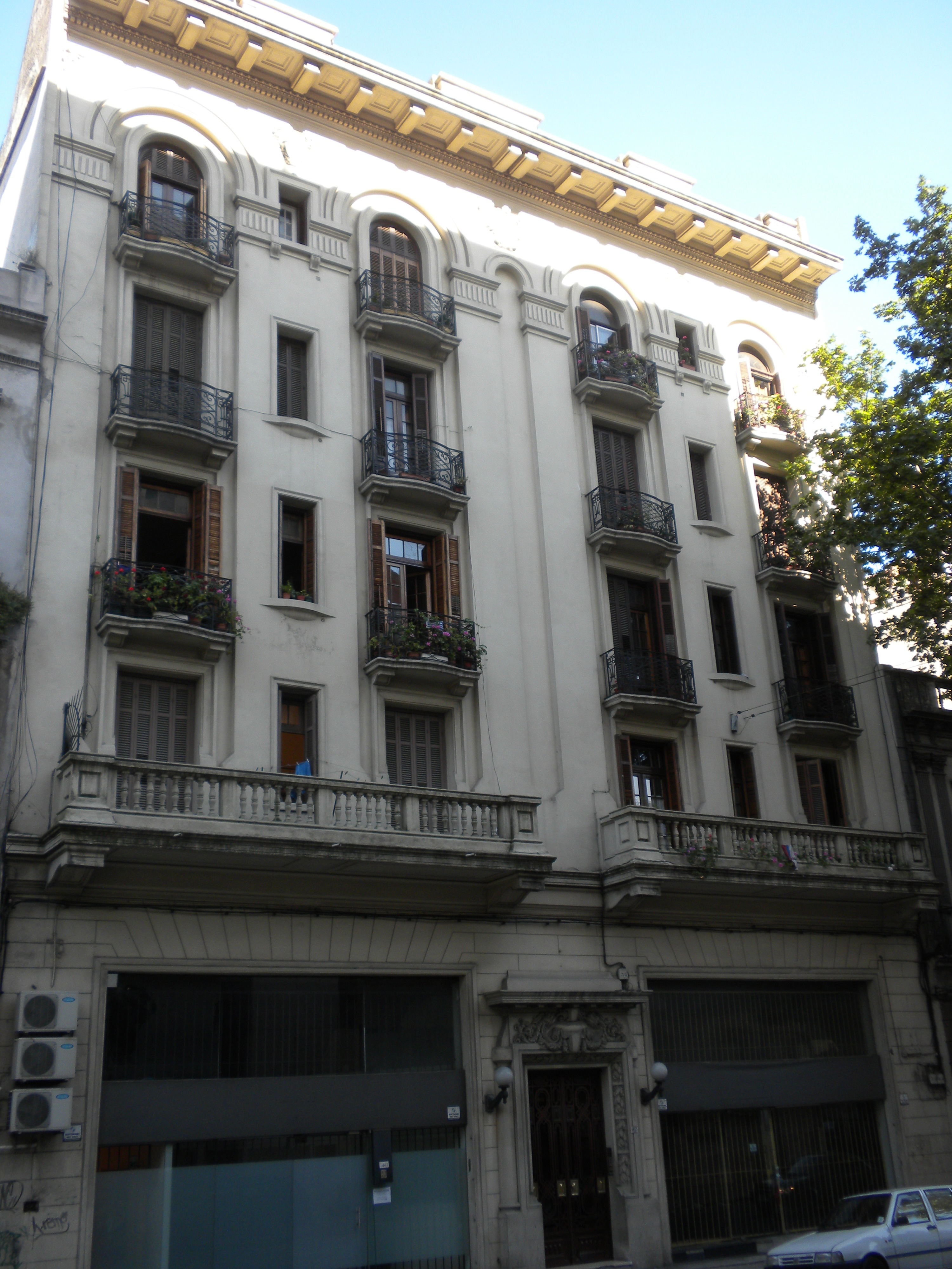 Edificio de renta construido a principios del siglo XX, característico de esta zona de la Ciudad Vieja. Se desarrolla en seis niveles y subsuelo, destinado a vivienda colectiva (cuatro por nivel) y locales comerciales en planta baja. Actualmente comparte el uso residencial con oficinas y en la planta baja y subsuelo funciona una empresa que importa insumos hospitalarios. Está ubicado en una parcela con dos frentes, uno hacia la calle Florida y otro hacia un pasaje peatonal interior a la manzana, originalmente utilizado para ingreso de carruajes. La fachada de la planta baja forma un basamento comercial que finaliza en dos balcones laterales con balaustrada. El cuerpo central del edificio está ritmado por la organización de las aberturas que definen paños verticales, rematando en una gran cornisa. Es de señalar el cuidadoso tratamiento de las circulaciones, el ascensor de madera, la escalera y los halles de cada piso. Se encuentra en buen estado, integrando un tramo patrimonial destacado sobre la calle Florida.