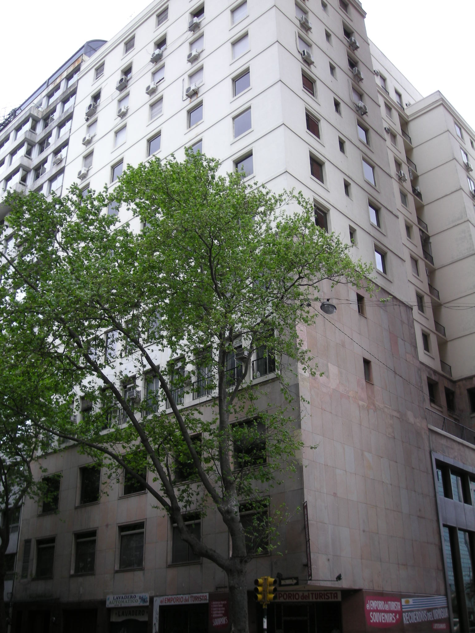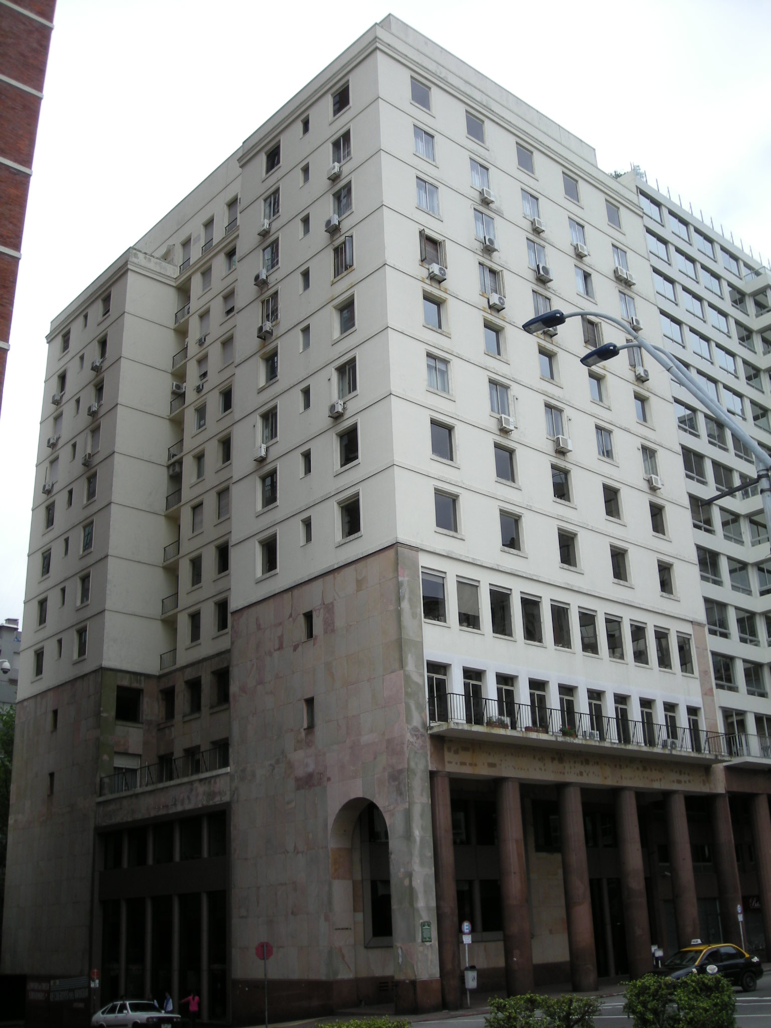Edificio de propiedad horizontal construido en la década de 1950. Se desarrolla en catorce plantas destinadas originalmente a oficina, vivienda, y locales comerciales en planta baja. Organizaba un sector de vivienda con acceso sobre la calle Colonia, y uno de oficinas sobre la Plaza Independencia, ocupando los tres primeros niveles. El edificio forma parte de un entorno sobre la rinconada norte de la Plaza Independencia, concebido con edificación en altura y pasiva. Su fachada presenta un basamento continuo con grandes columnas, sobre el cual se eleva el volumen principal en forma de U. En la última década fue reformado para ser utilizado en su totalidad por oficinas. Su estado de conservación es bueno.