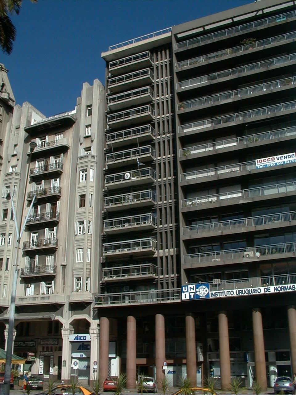 | Arquitectónica: | Correcto edificio de volúmen neutro cuya fachada a Plaza Independencia está determinada por dos sectores, un área de balcones horizontales y una zona conformada por delgadas pilastras de hormigón que acentúan el eje vertical. La fachada hacia San José, si bien es correcta no presenta valores a señalar. |
