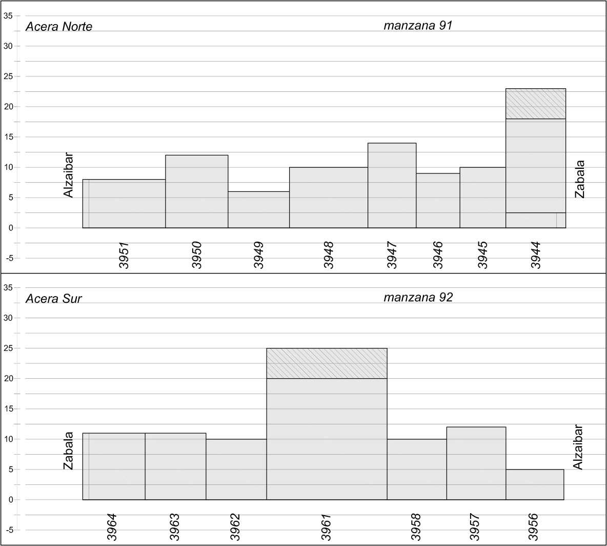 | 5.2 Valoración: | Tramo calificado por la presencia de algunos grupos testimoniales. La acera norte, está caracterizada por la calidad y homogeneidad de las edificaciones realizadas a fines del siglo XIX y principios del XX. Mientras tanto, en la acera sur, un grupo de edificios de la segunda mitad del siglo XIX, -ubicado hacia la esquina de Zabala-, aporta valores que contribuyen a la consolidación de un tramo de carácter heterogéneo. |