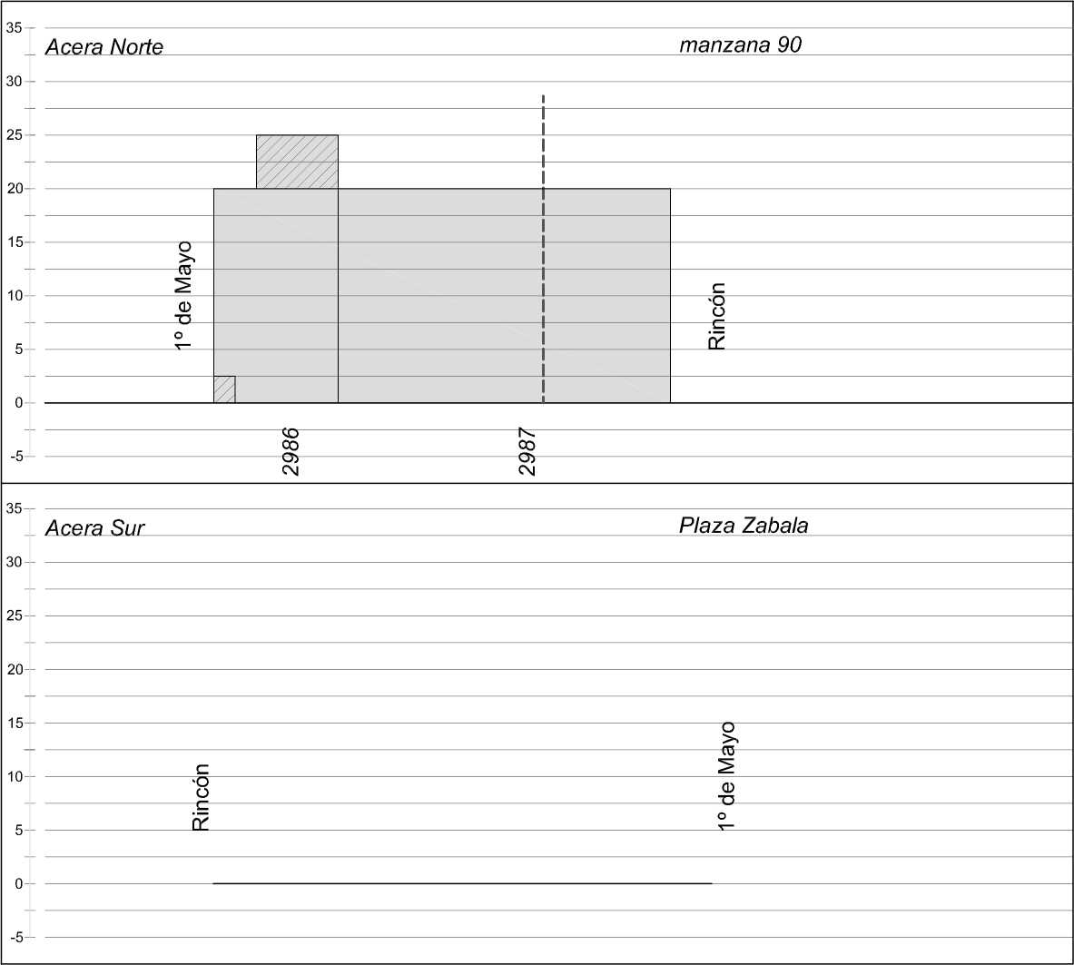 | 5.2 Valoración: | Pequeño tramo, muy particular, caracterizado por edificaciones que conforman un plano frontal continuo sobre la alineación oficial, más allá de ciertos juegos volumétricos que presentan sus fachadas, colaborando en la definición espacial de los bordes de la Plaza Zabala. |