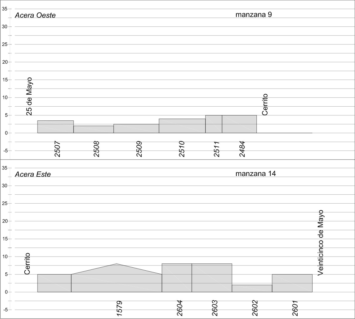 | 5.2 Valoración: | Sobre la acera oeste se observan una sucesión de construcciones similares en altura, alineaciones y lenguaje arquitectónico que le otorgan homogeneidad a parte del tramo. También presenta edificios de mediados del siglo XIX y principios del siglo XX que aportan valores señalables al tramo. En la esquina de Cerrito y Guaraní el retiro que se observa en la manzana 9 genera la Plaza Isabelino Gradín, espacio público valioso por sus calidades ambientales. |