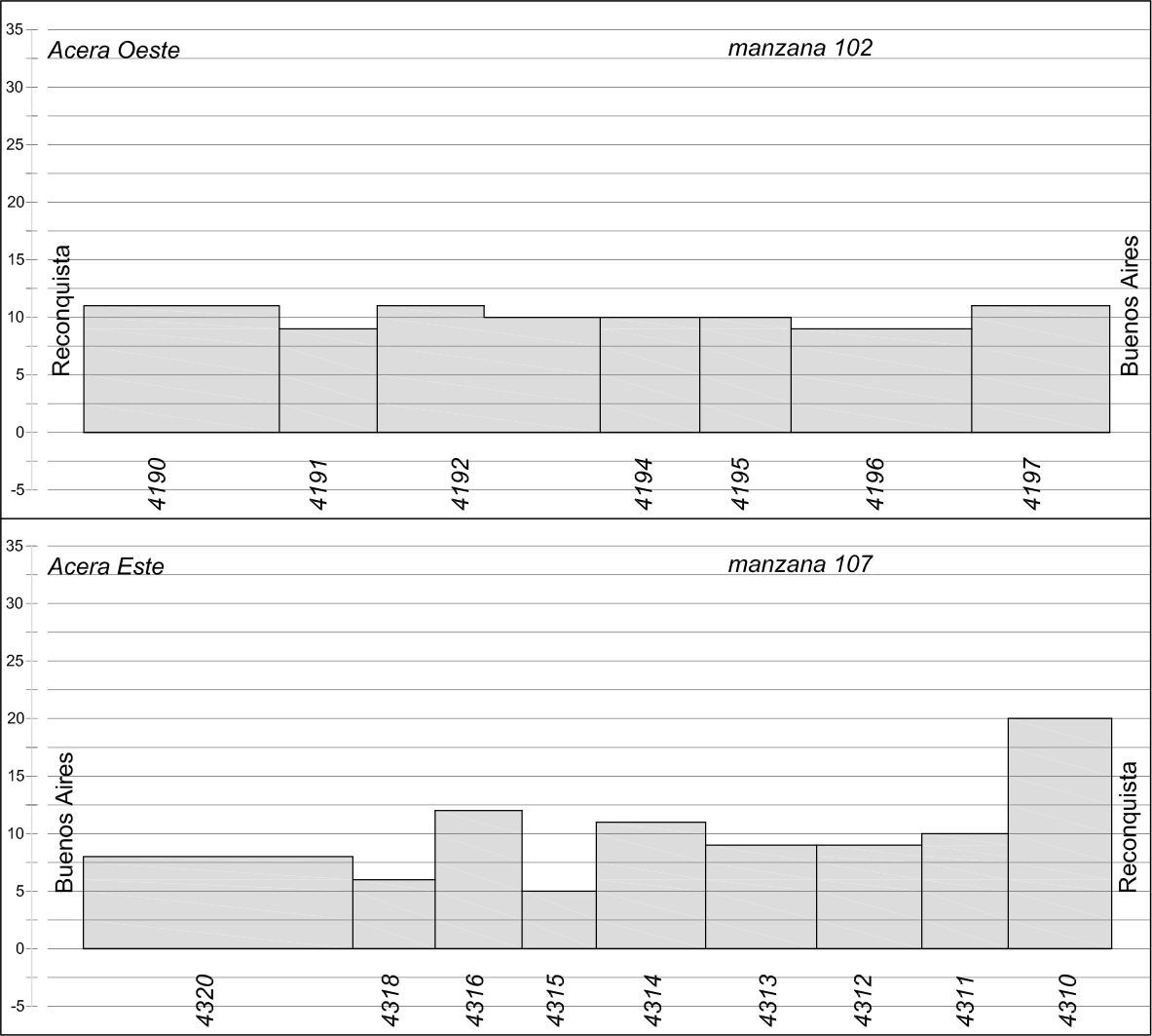 | 5.2 Valoración: | Tramo en el que se destaca el sector hacia Buenos Aires, acera oeste, homogéneo en alturas e integrado por edifcios con valores arquitectónicos, que a pesar de sus diferencias estilísticas se relacionan correctamente y otorgan calidad al entorno. |