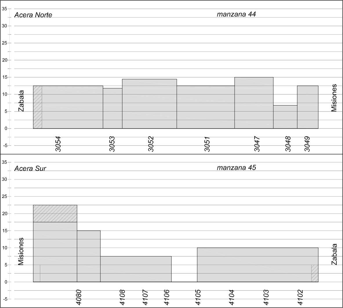 | 5.2 Valoración: | La fuerte presencia de edificios institucionales y de valor patrimonial (Banco Francés, exBanco Italiano, exBanco Popular, Museo Romántico), caracteriza el tramo en su sector oeste hacia la calle Zabala. Dicha continuidad se ve alterada en el sector este por la alternativa de edificios de altura de épocas disímiles. La presencia de un baldío en la acera sur, va en desmedro de la calidad ambiental del tramo. |